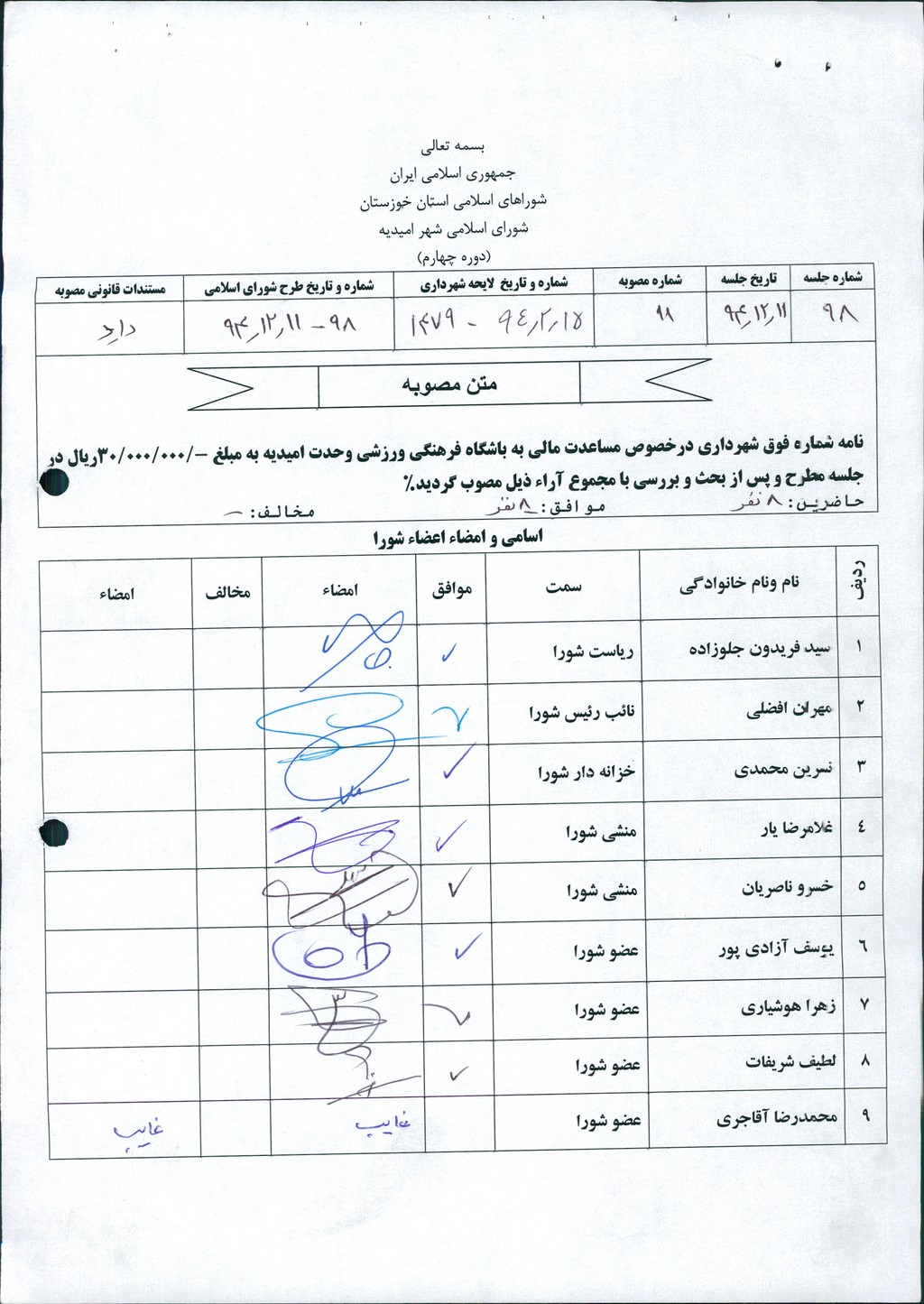 مصوبه شماره ۱۱ جلسه شماره ۹۸ مورخ ۹۴/۱۲/۱۱ شورای اسلامی شهر امیدیه