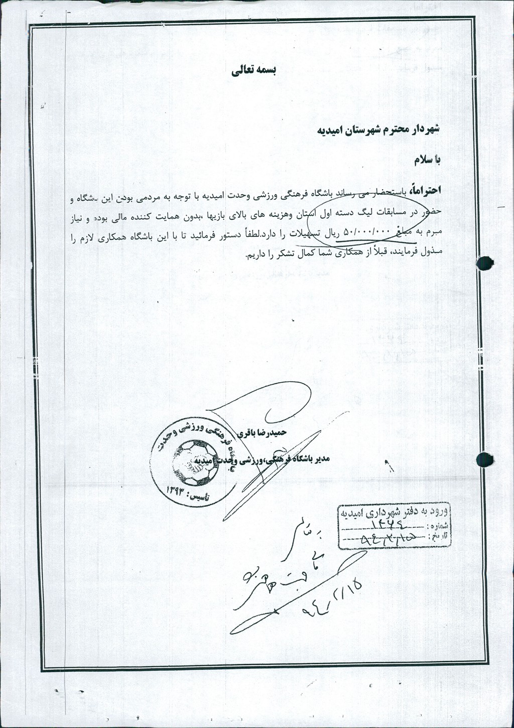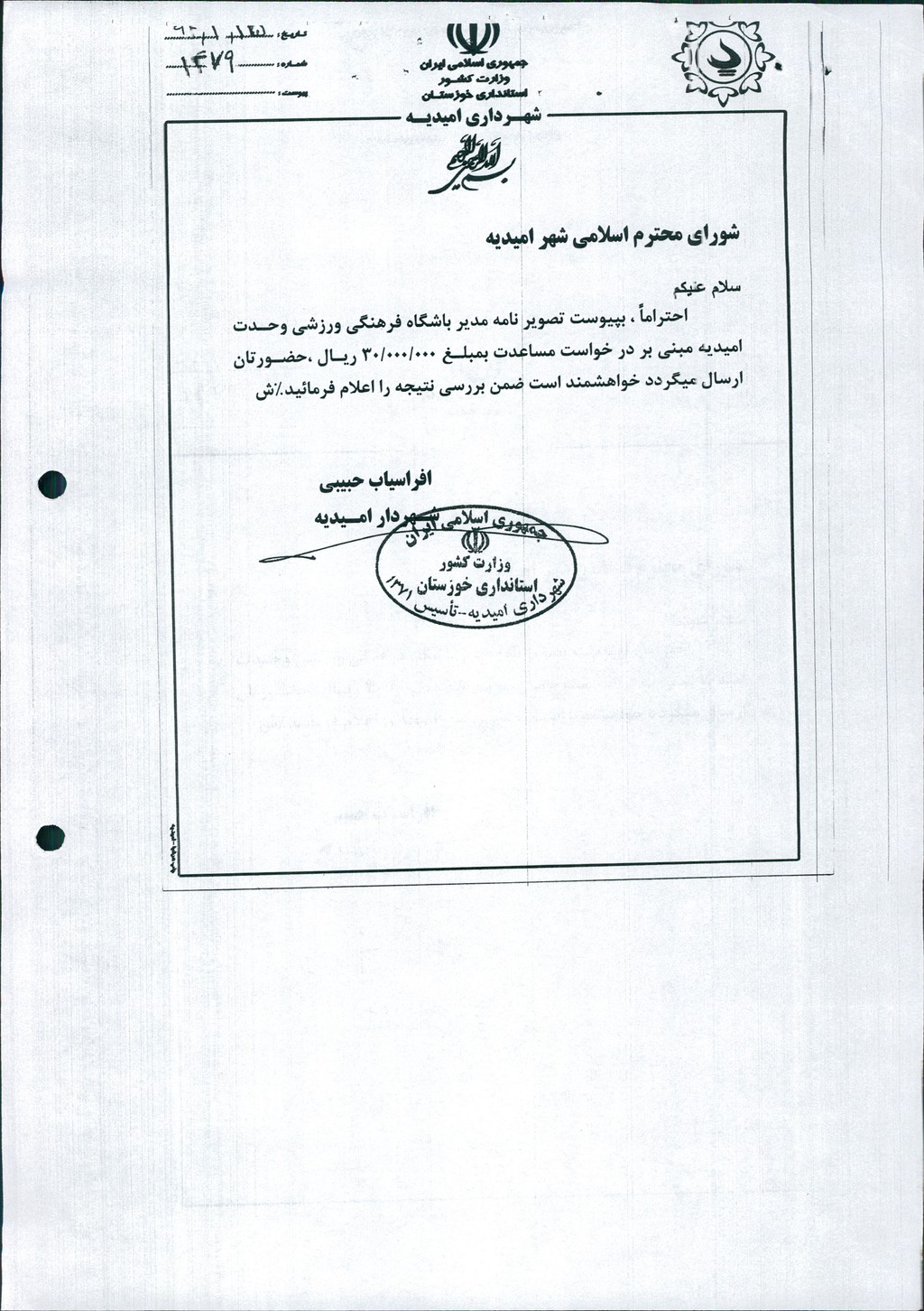 نامه شماره فوق شهرداری درخصوص مساعدت مالی به باشگاه فرهنگی ورزشی وحدت امیدیه به مبلغ ۳۰۰۰۰۰۰۰ ريال در جلسه مطرح و پس از بحث و بررسی با مجموع آراء ذیل مصوب گردید%