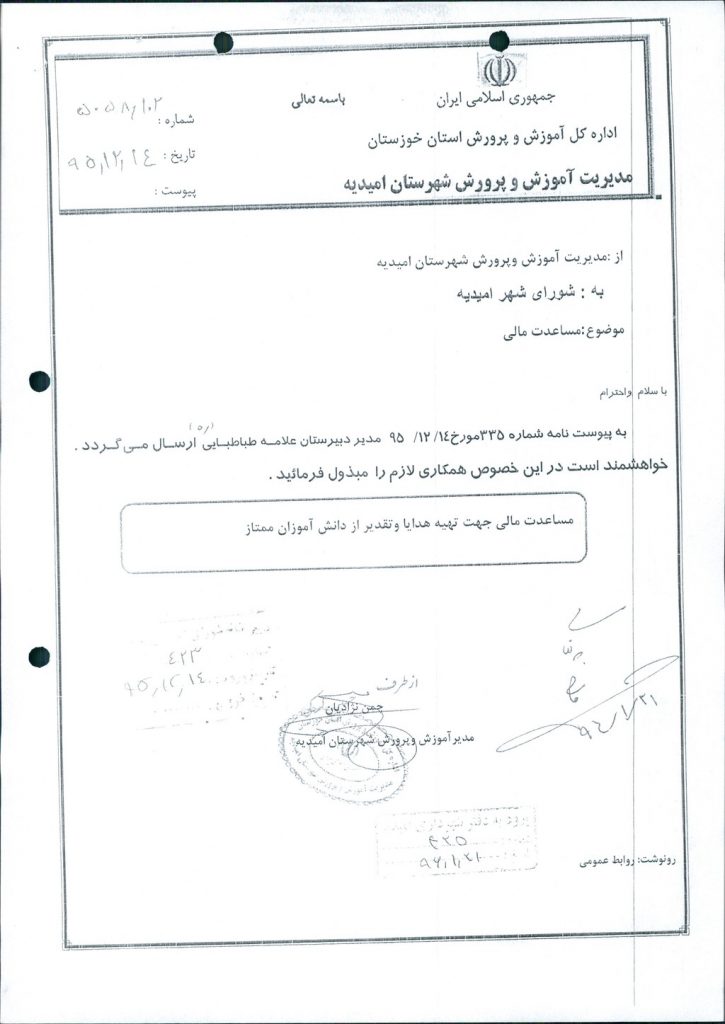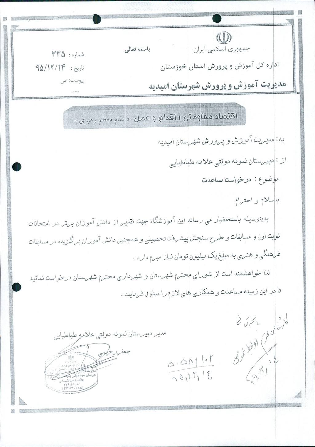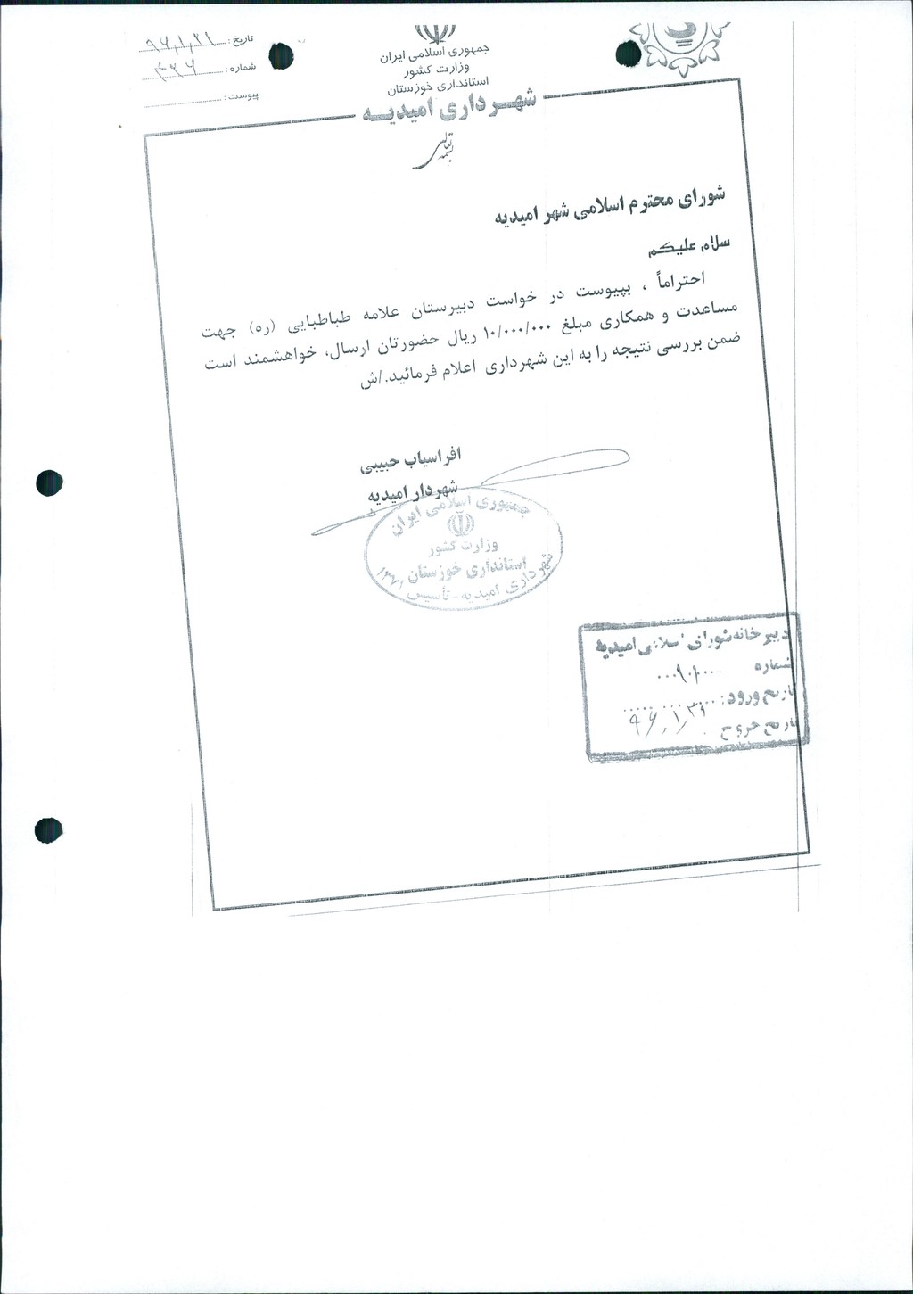 نامه شماره فوق شهرداری در خصوص مساعدت به دبیرستان علامه طباطبایی (ره) به مبلغ ۱۰۰۰۰۰۰۰ ریال در جلسه مطرح و پس از بحث و بررسی با مجموع آراء ذیل مصوب گردید%