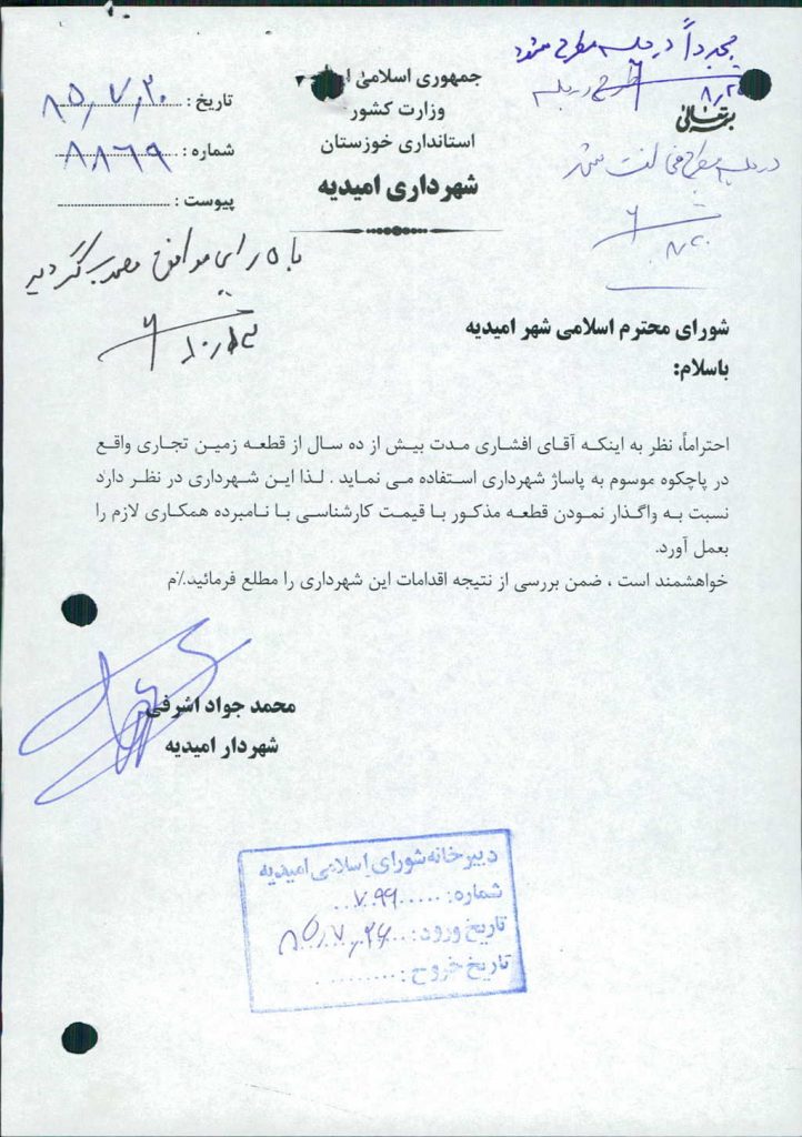 ۱۲-نامه شماره ۸۸۶۹-۲۰/ ۷/ ۸۵شهرداري درخصوص واگذاري قطعه زمين به متراژ ۱۵۰متر مربع درپاچكوه به آقاي افشار بود كه با ۵رأي موافق مصوب گرديد.