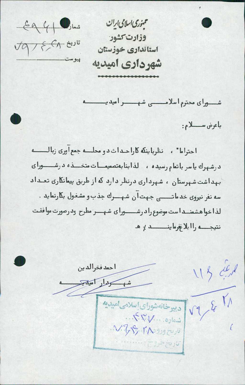 مصوبه شماره ۱۳ جلسه شماره ۱۱۶ شورای اسلامی شهر امیدیه