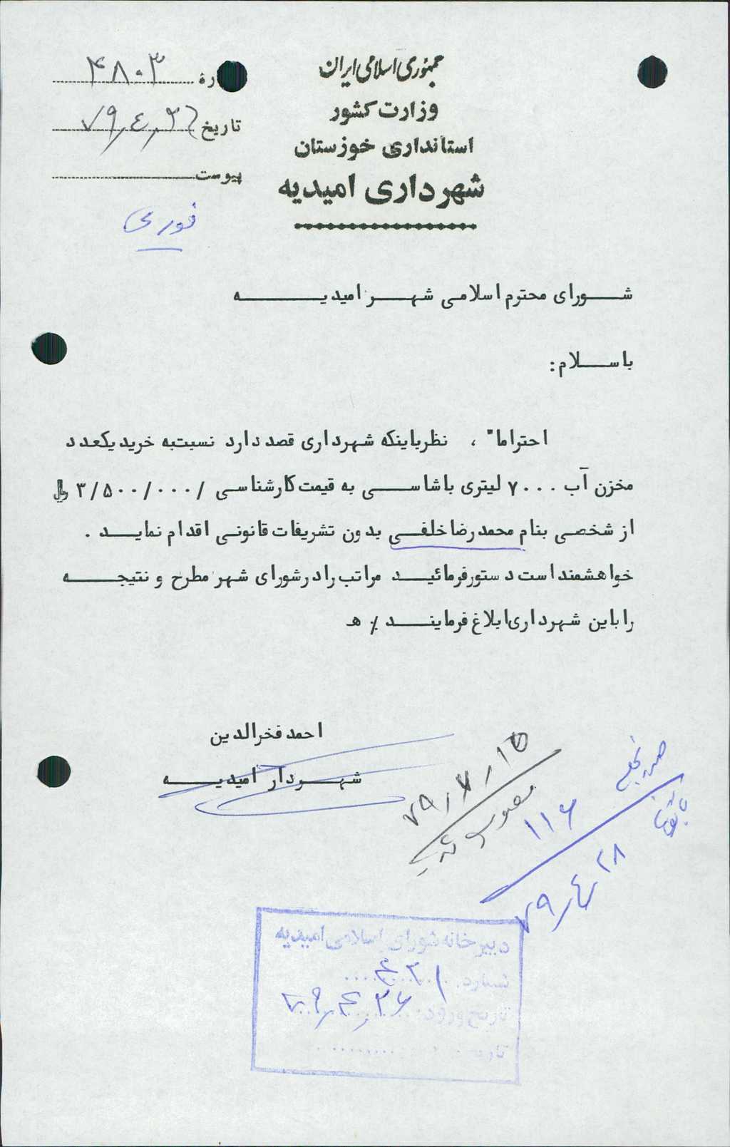 ۱۳-عطف به نامه شماره ۴۸۰۳مورخه ۲۶/ ۴/ ۷۹ با توجه به بررسي مجدد مقررشد با ترك تشريفات قانوني عمل شود.