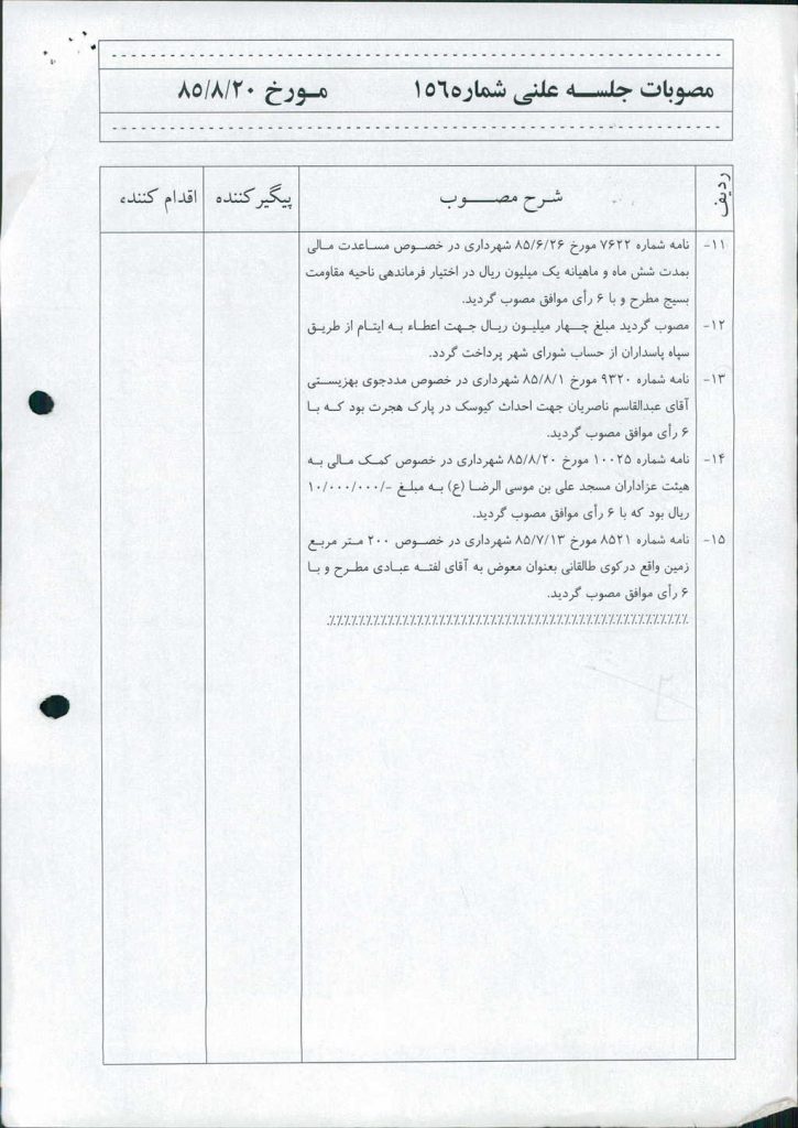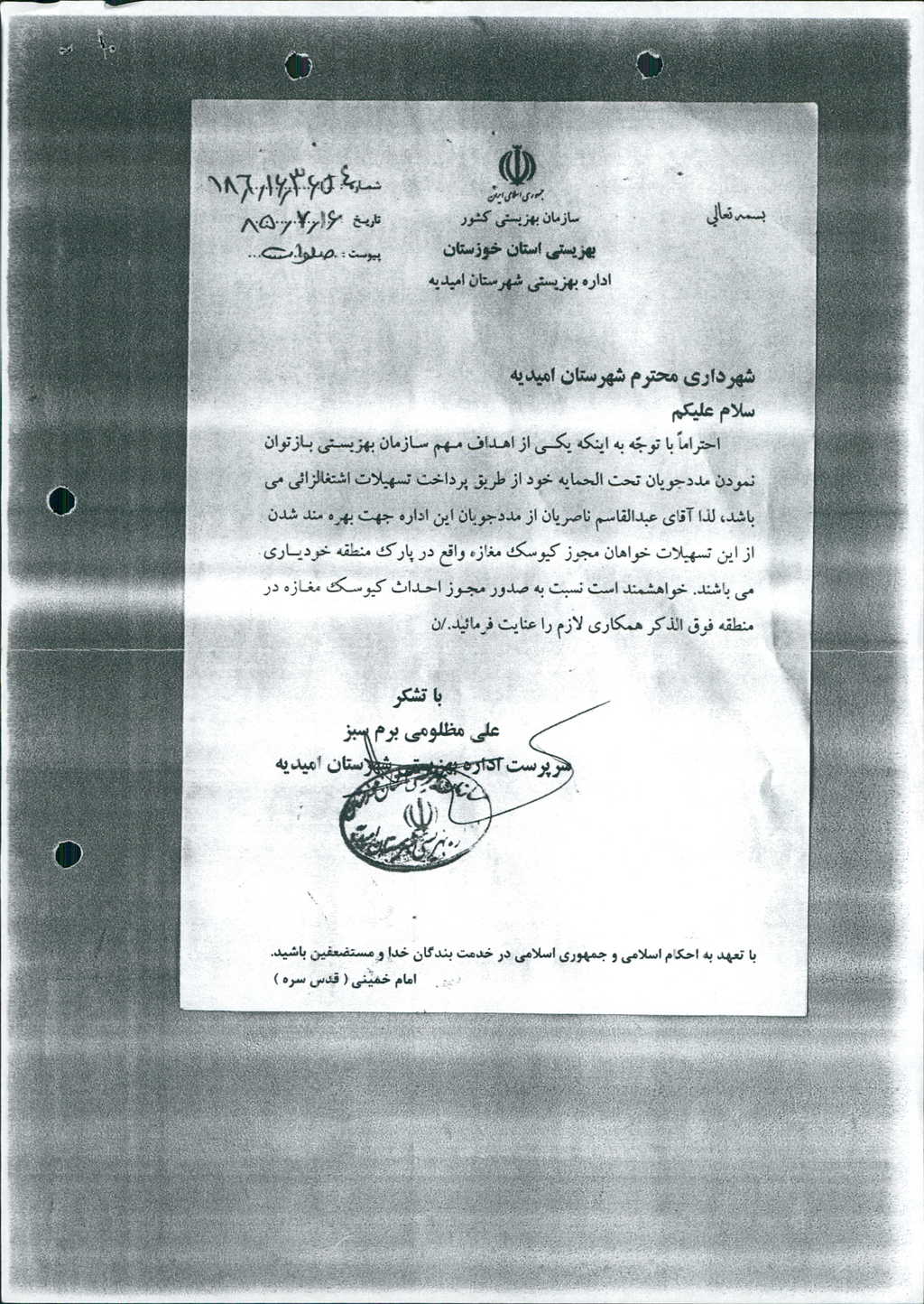 ۱۳-نامه شماره ۹۳۲۰ مورخ ۱/ ۸/ ۸۵ شهرداري در خصوص مددجوي بهزيستي آقاي عبدالقاسم ناصريان جهت احداث كيوسك در پارك هجرت بود كه با ۶ رأي موافق مصوب گرديد.