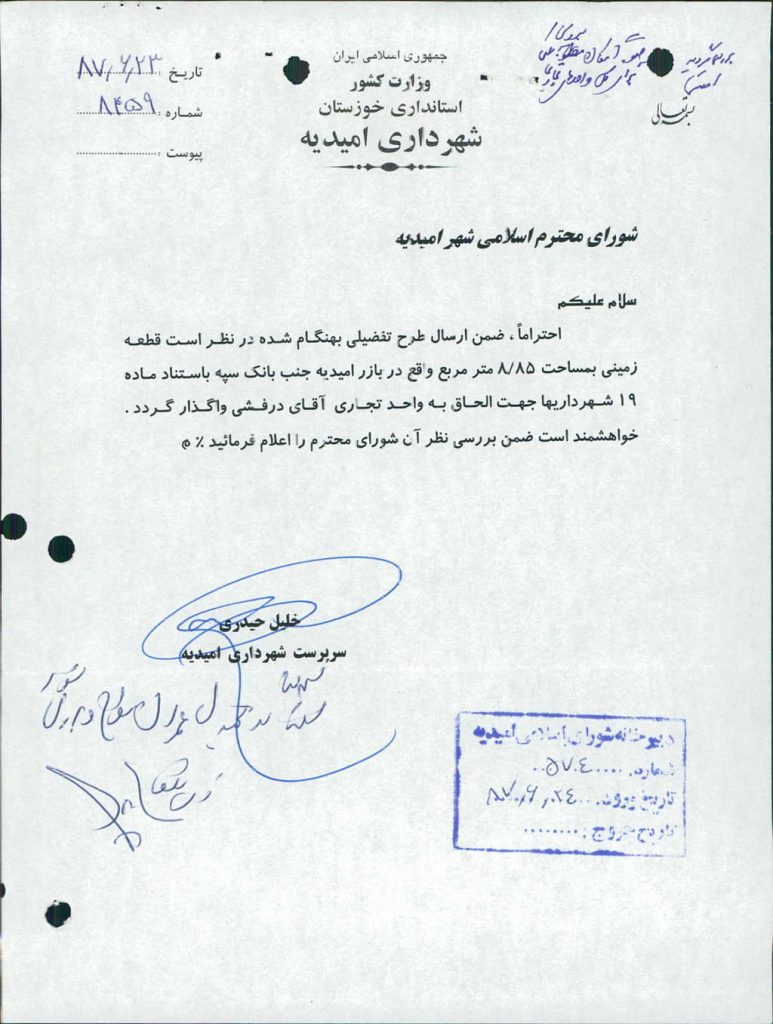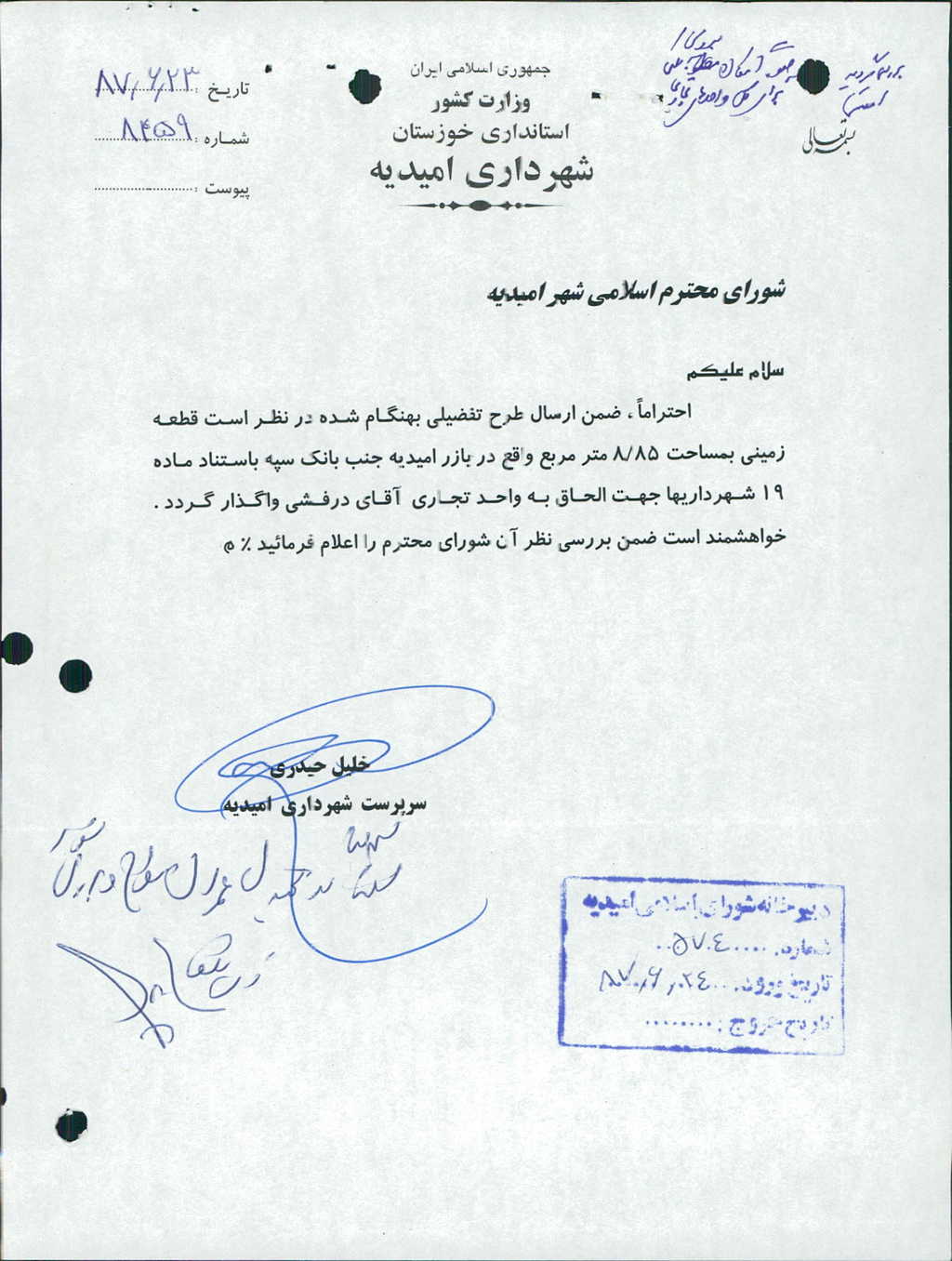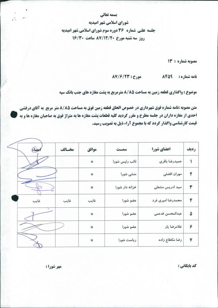 متن مصوبه :نامه شماره فوق شهرداری در خصوص الحاق قطعه زمین فوق به مساحت ۸/۸۵ متر مربع به آقای درفشی احدی از مغازه داران در جلسه مطرح و مقرر گردید کلیه قطعات پشت مغازه ها به متراژ فوق به صاحبان مغازه ها و به قیمت کارشناسی واگذار گردد که با مجموع آراء ذیل به تصویب رسید.
