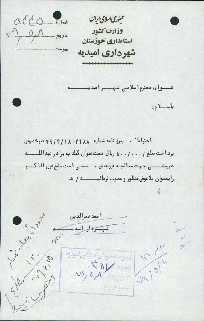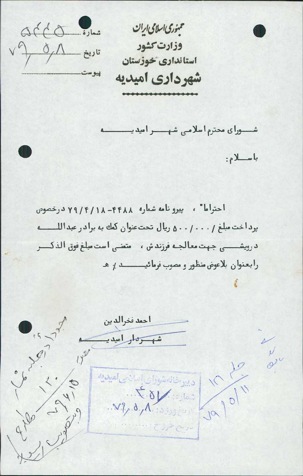 ۱۴-عطف به نامه شماره ۵۴۴۵ مورخه۸/ ۵/ ۷۹ شهرداري در خصوص مساعدت به آقاي عبدالله درويشي كارمند آن اداره موافقت بعمل آمد.