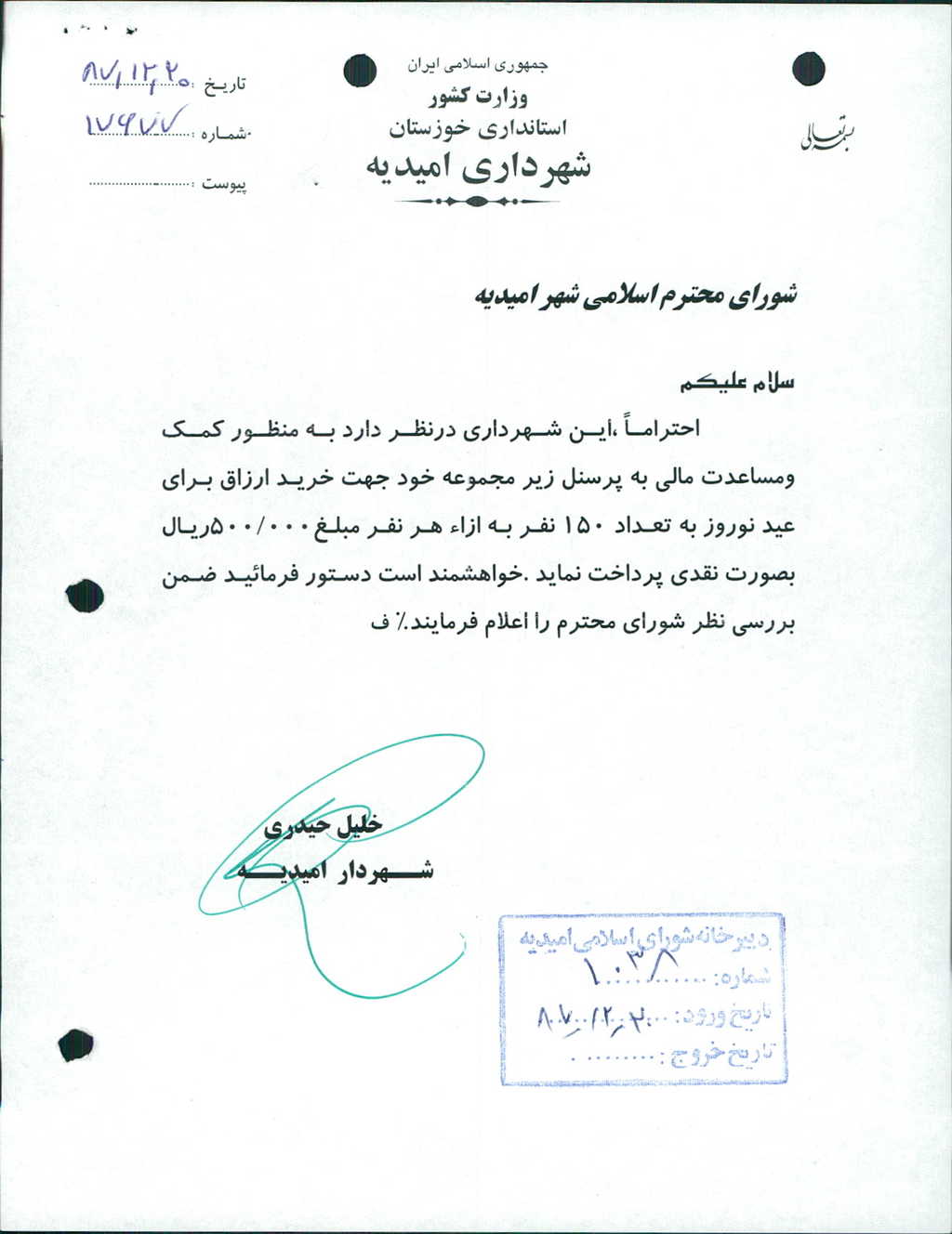 موضوع :خرید ارزاق یا پرداخت عیدی به مبلغ ۵۰۰۰۰۰ ريال به پرسنل محترم شهرداری