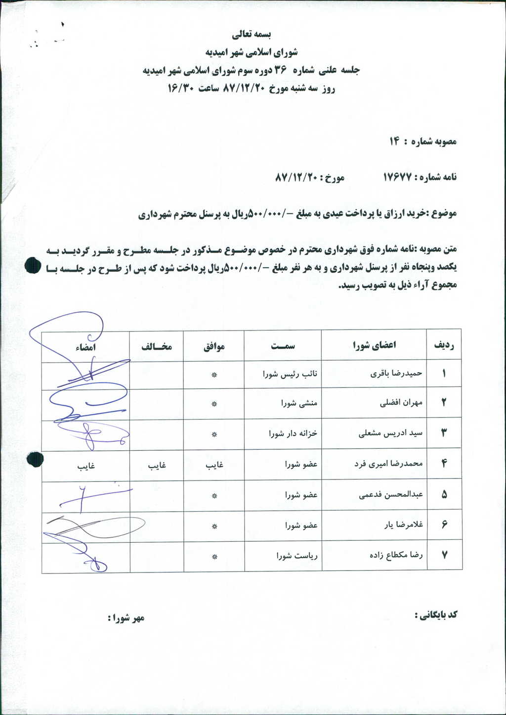 متن مصوبه :نامه شماره فوق شهرداری محترم در خصوص موضوع مذکور در جلسه مطرح و مقرر گردید به یکصد وپنجاه نفر از پرسنل شهرداری و به هر نفر مبلغ ۵۰۰۰۰۰ ريال پرداخت شود که پس از طرح در جلسه با مجموع آراء ذیل به تصویب رسید.