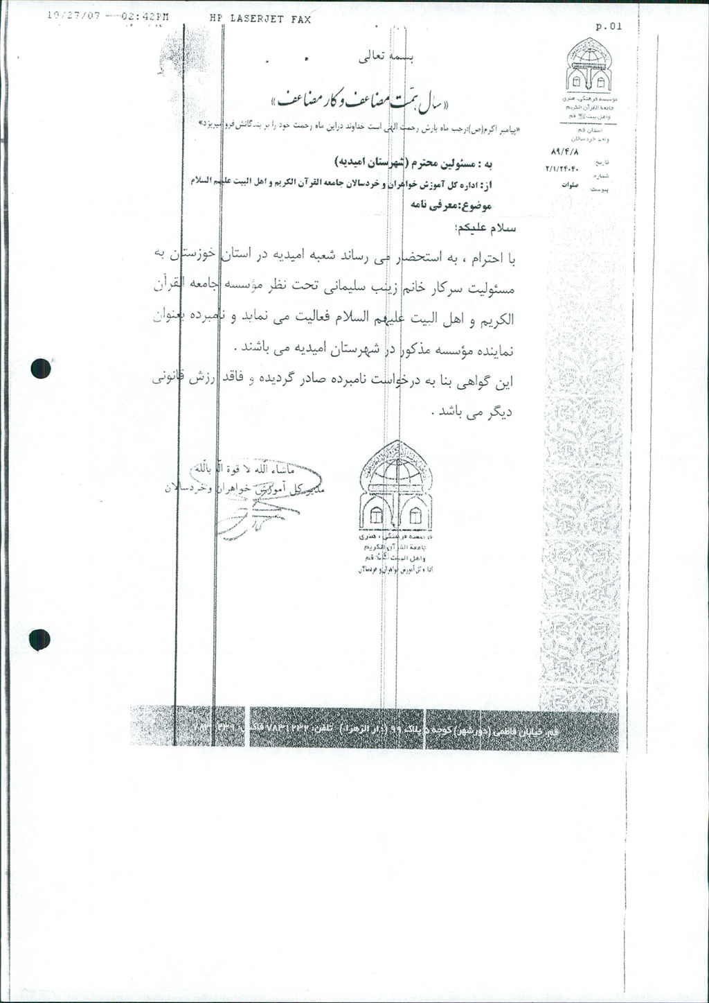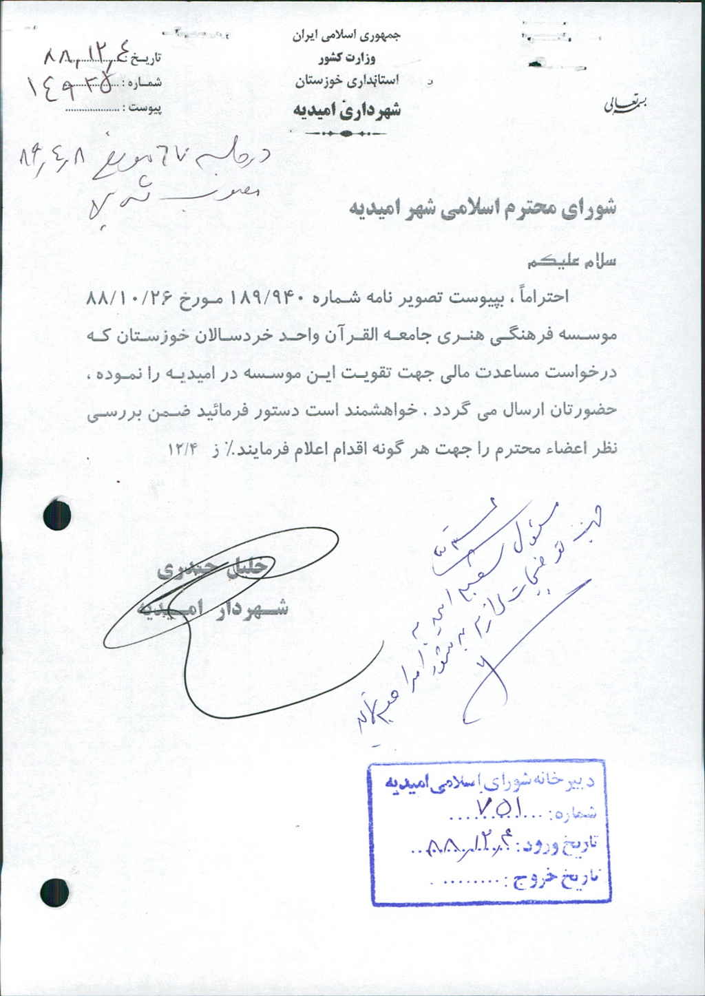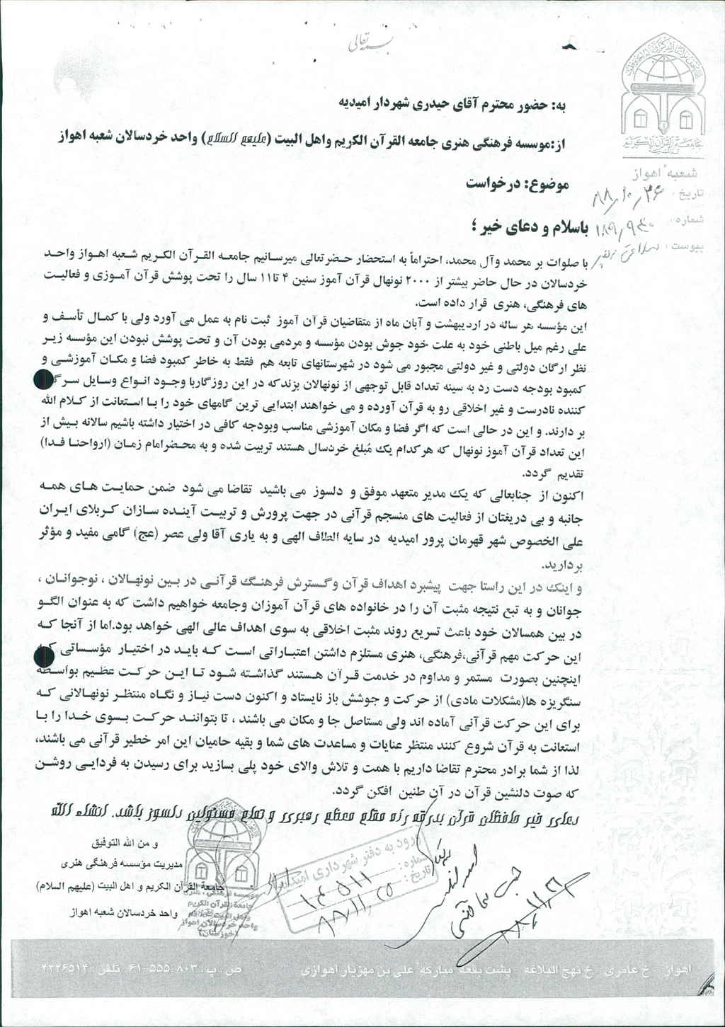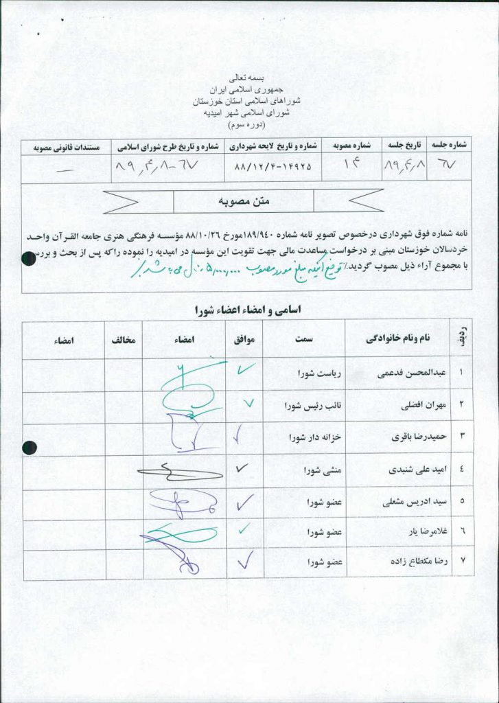 نامه شماره فوق شهرداری درخصوص تصویر نامه شماره ۱۸۹/۹۴۰مورخ ۸۸/۱۰/۲۶ مؤسسـه فرهنگی هنری جامعه القرآن واحد خردسالان خوزستان مبنی بر درخواست مساعدت مالی به مبلغ ۵/۰۰۰/۰۰۰ ریال جهت تقویت این مؤسسه در امیدیه را نموده که پس از بحث و بررسی با مجموع آراء ذیل مصوب گردید%