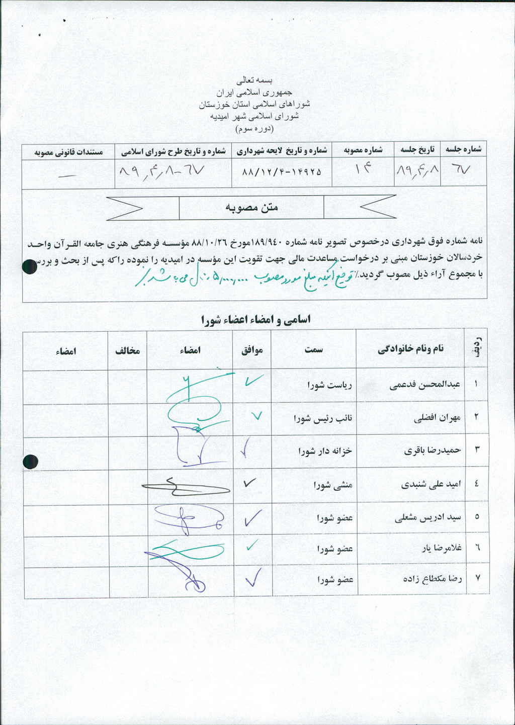 مصوبه شماره ۱۴ جلسه شماره ۶۷ شورای اسلامی شهر امیدیه