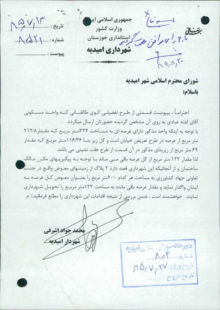 مصوبه شماره ۱۵ جلسه شماره ۱۵۶ شورای اسلامی شهر امیدیه