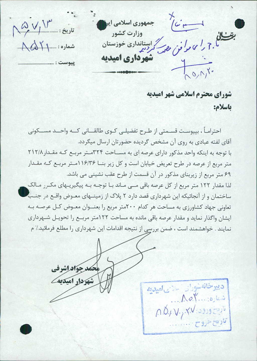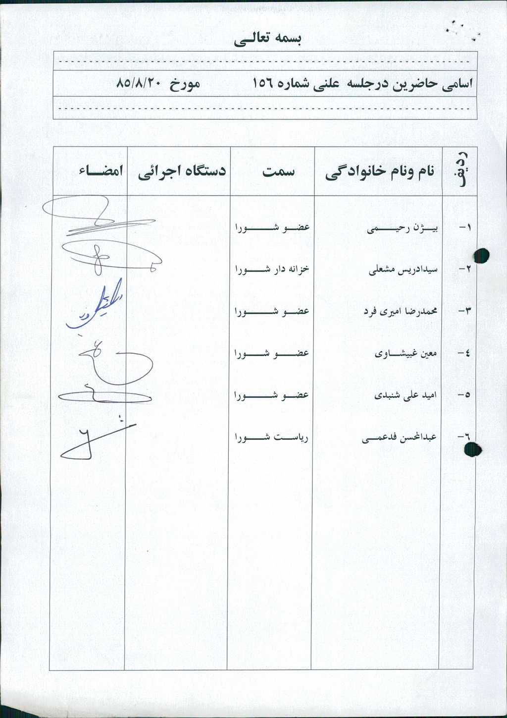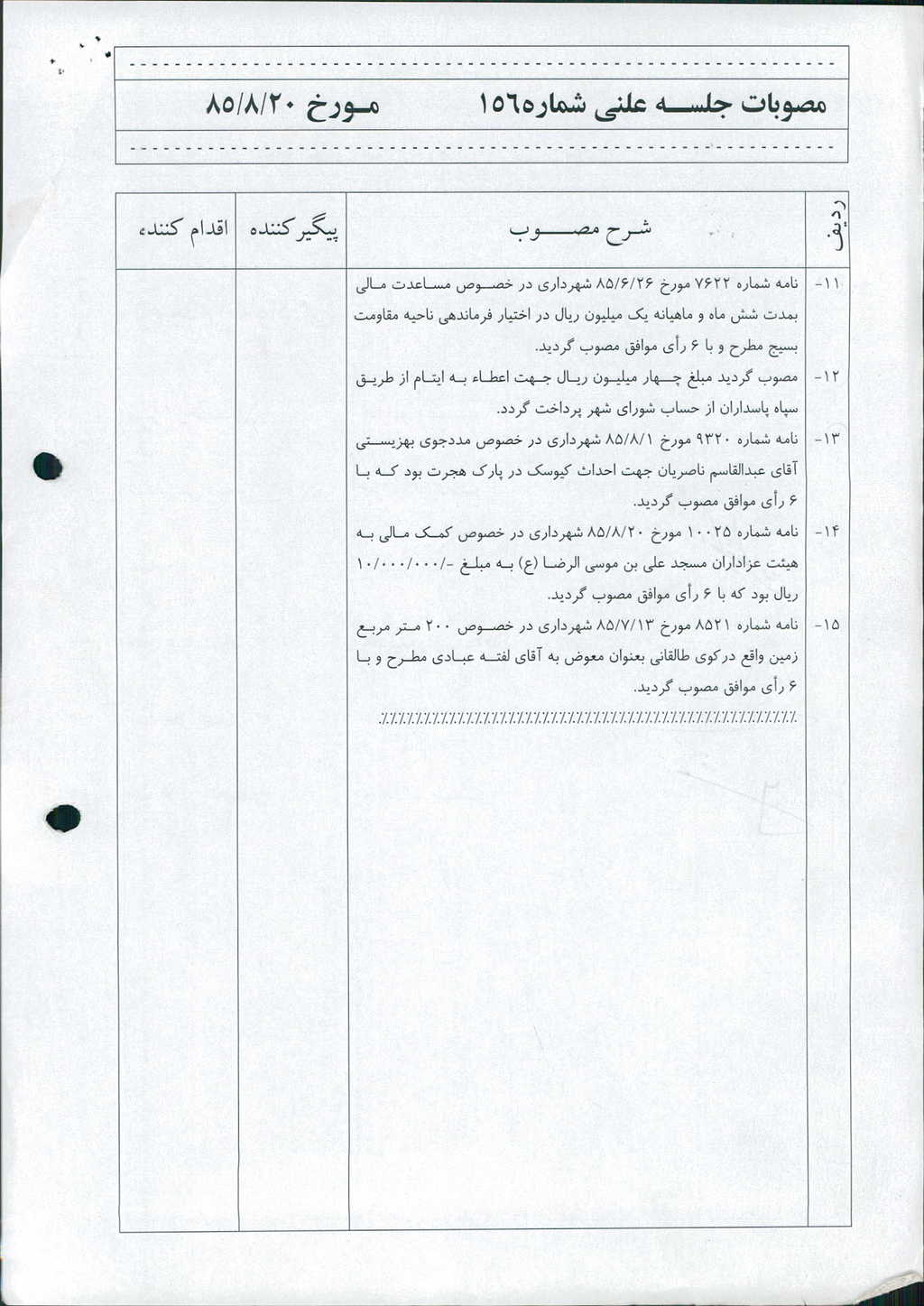 مصوبه شماره ۱۵ جلسه شماره ۱۵۶ مورخ ۸۵/۸/۲۰ شورای اسلامی شهر امیدیه