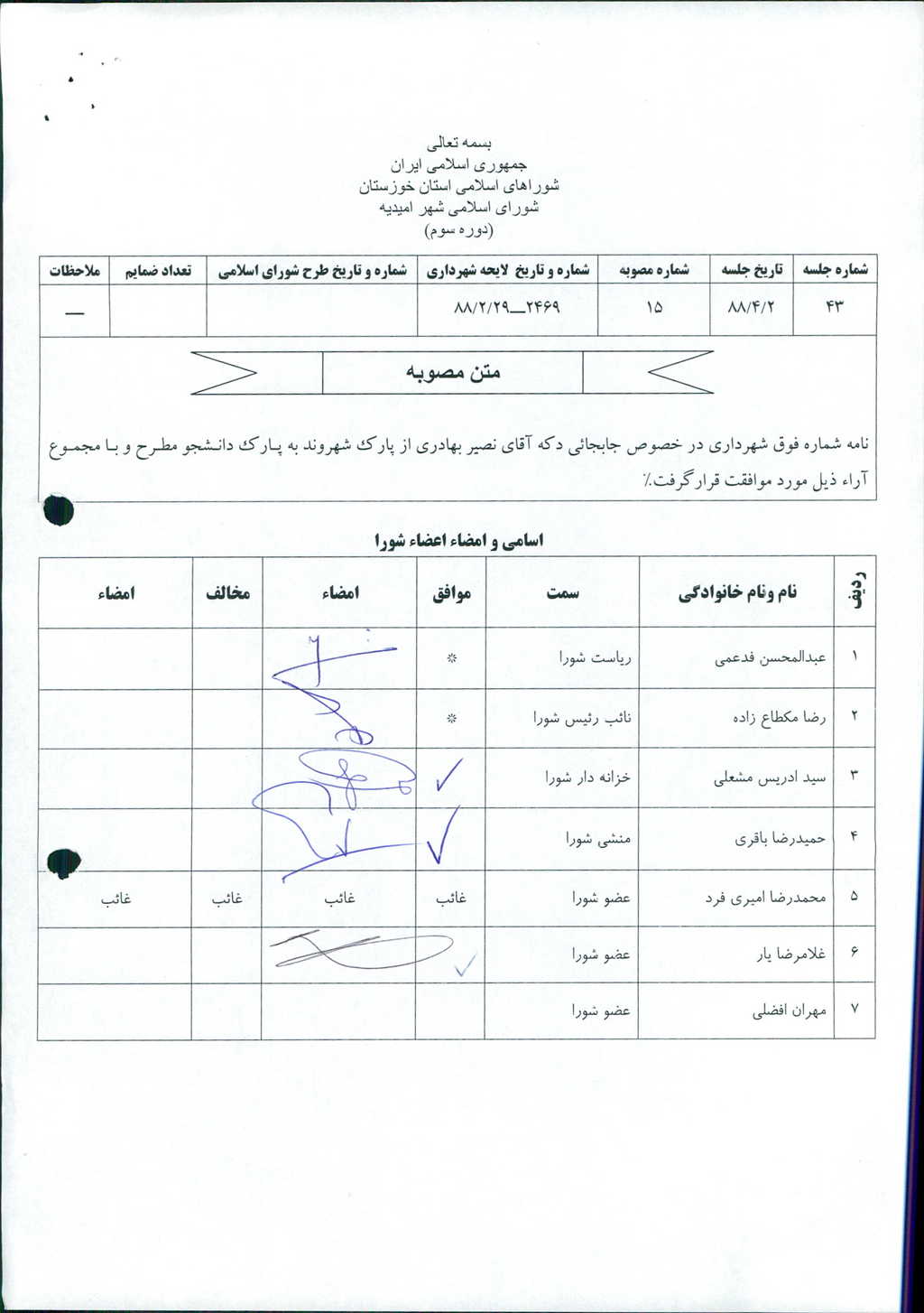 بسم الله الرحمن الرحیم مصوبه شماره ۱۵ جلسه شماره ۴۳ شورای اسلامی شهر امیدیه