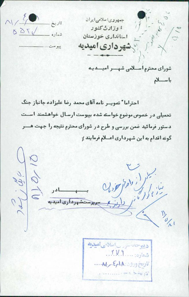 ۱۷-نامه شماره۵۵۲۷مورخه۱۸/ ۴/ ۸۱شهرداري درخصوص درخواست مساعدت مالي به آقاي محمدرضاعليزاده جانباز جنگ تحميلي پس از بحث وبررسي با۶رأي موافق مصوب گرديد مبلغ۰۰۰/۰۰۰/ ۲ ريال(دوميليون ريال)در وجه ايشان پرداخت گردد.