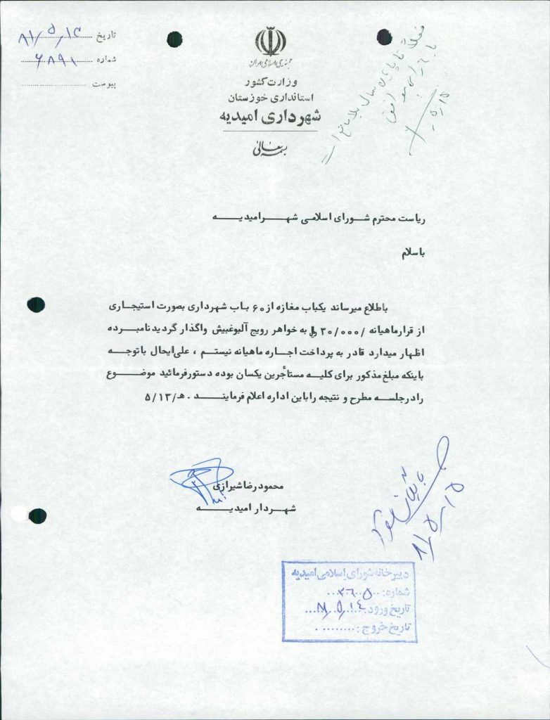 مصوبه شماره ۱۷ جلسه شماره ۲۸۵ شورای اسلامی شهر امیدیه