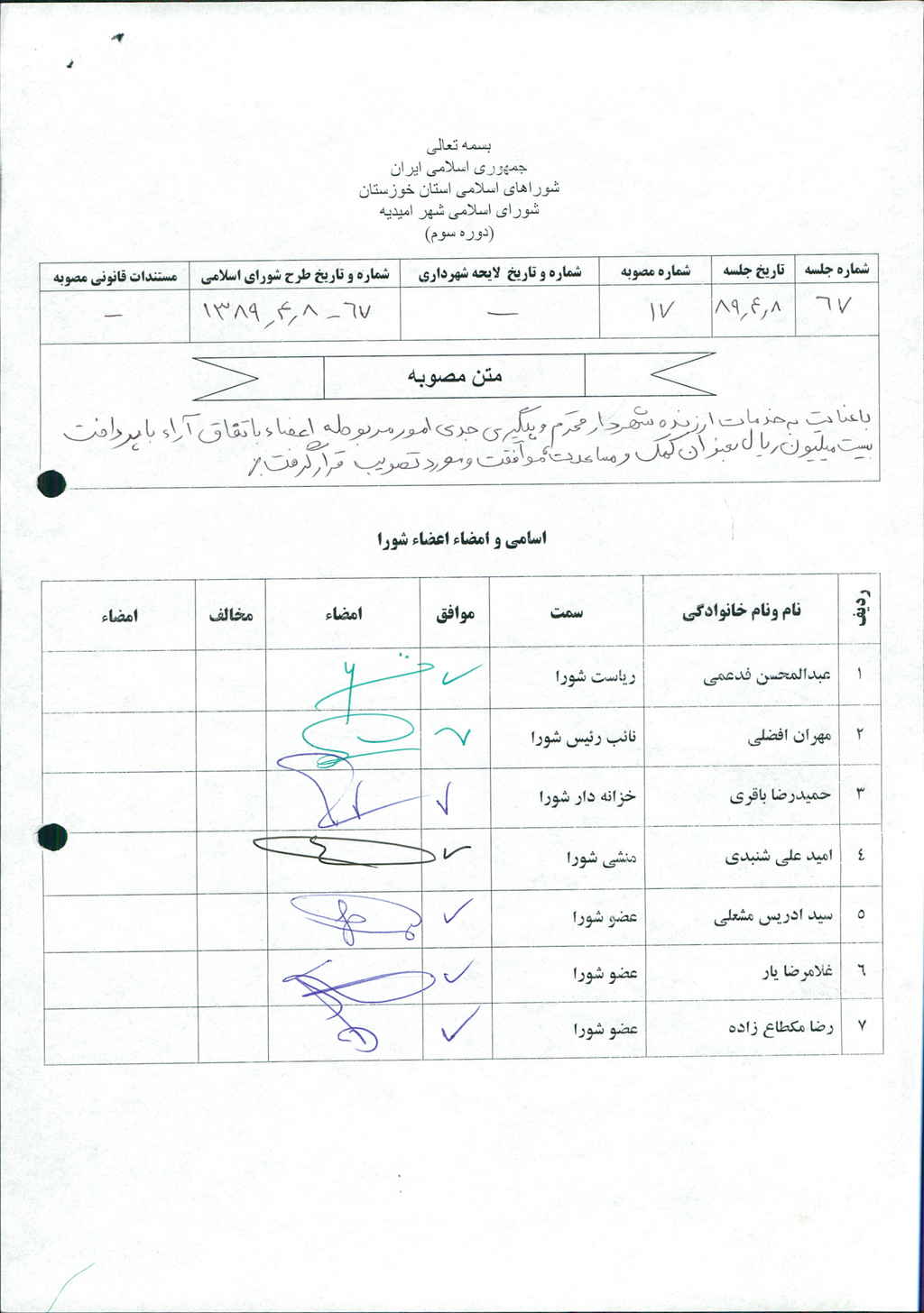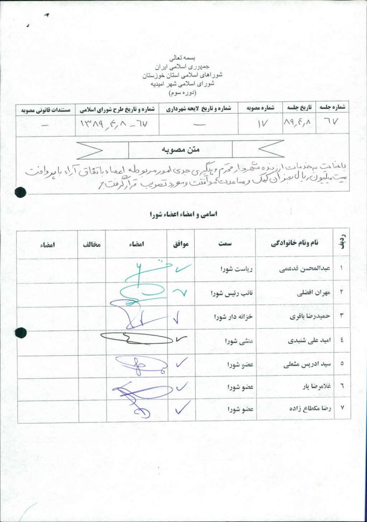 مصوبه شماره ۱۷ جلسه شماره ۶۷ شورای اسلامی شهر امیدیه