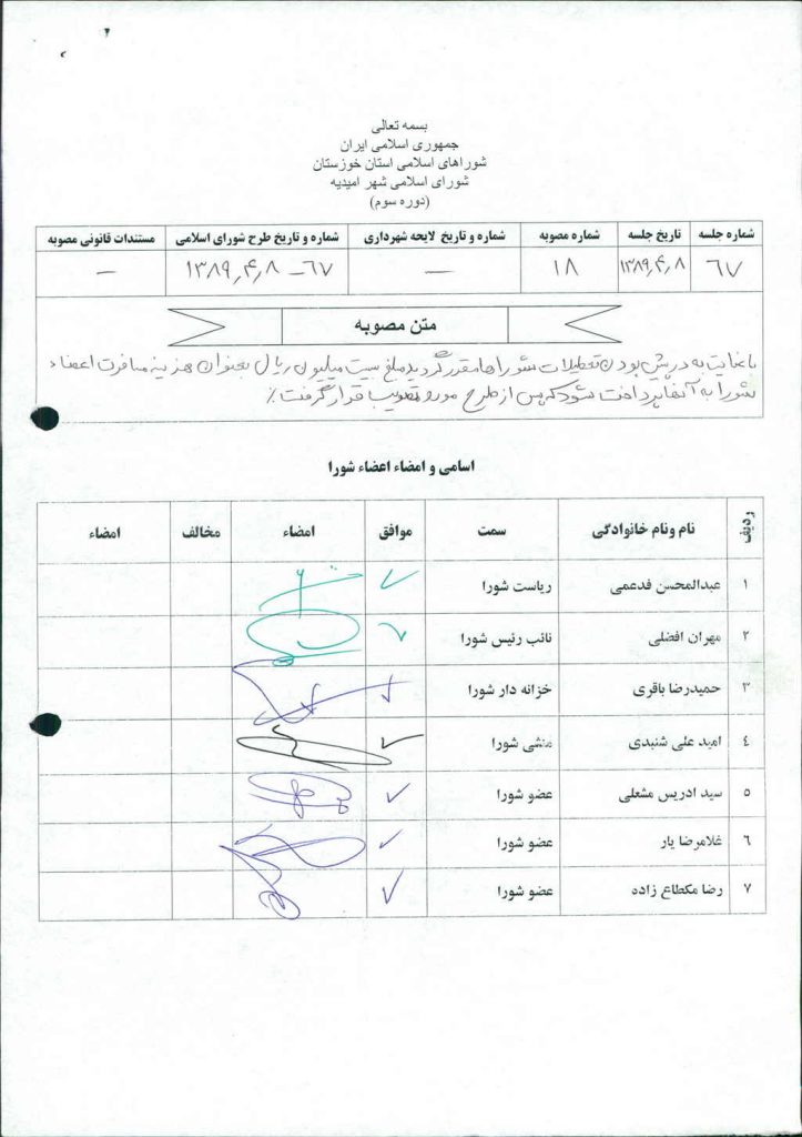 مصوبه شماره ۱۸ جلسه شماره ۶۷ شورای اسلامی شهر امیدیه
