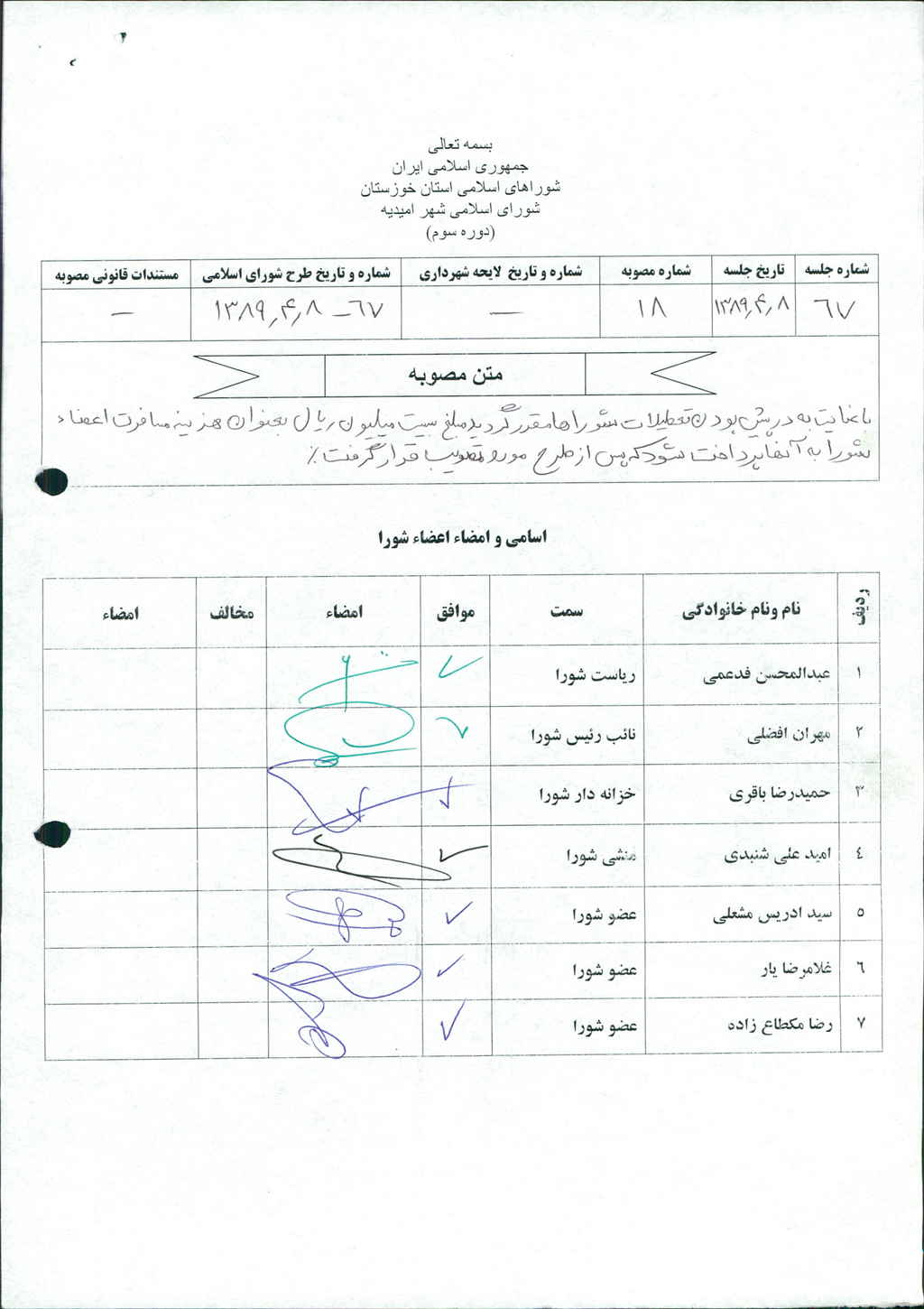 مصوبه شماره ۱۸ جلسه شماره ۶۷ مورخ ۸۹/۴/۸ شورای اسلامی شهر امیدیه