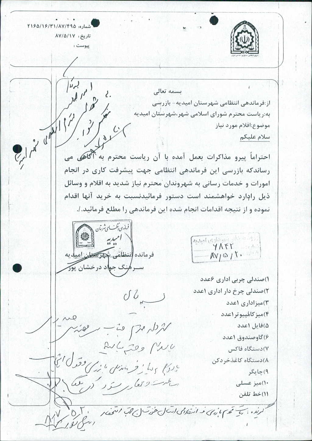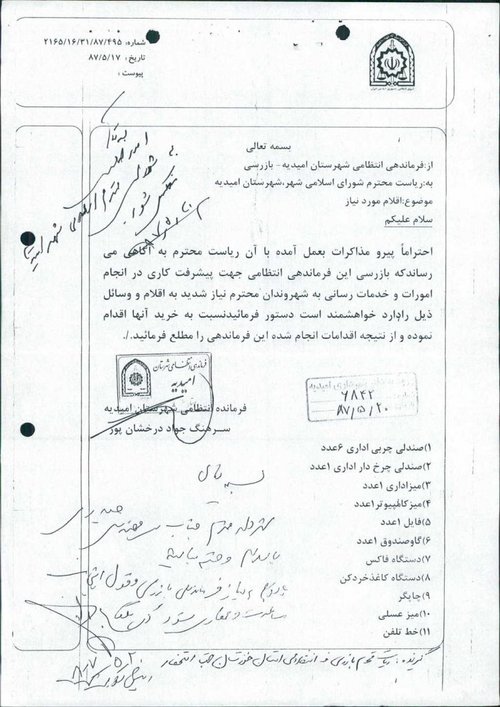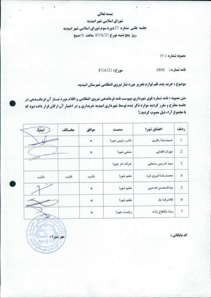 متن مصوبه : نامه شماره فوق شهرداری بپیوست نامه فرماندهی نیروی انتظامی و اقلام مورد نیاز آن فرماندهی در جلسه مطرح و مقرر گردید موارد ذکر شده توسط شهرداری امیدیه خریداری و در اختیار آن ارگان قرار داده شود که با مجموع آراء ذیل مصوب گردید%