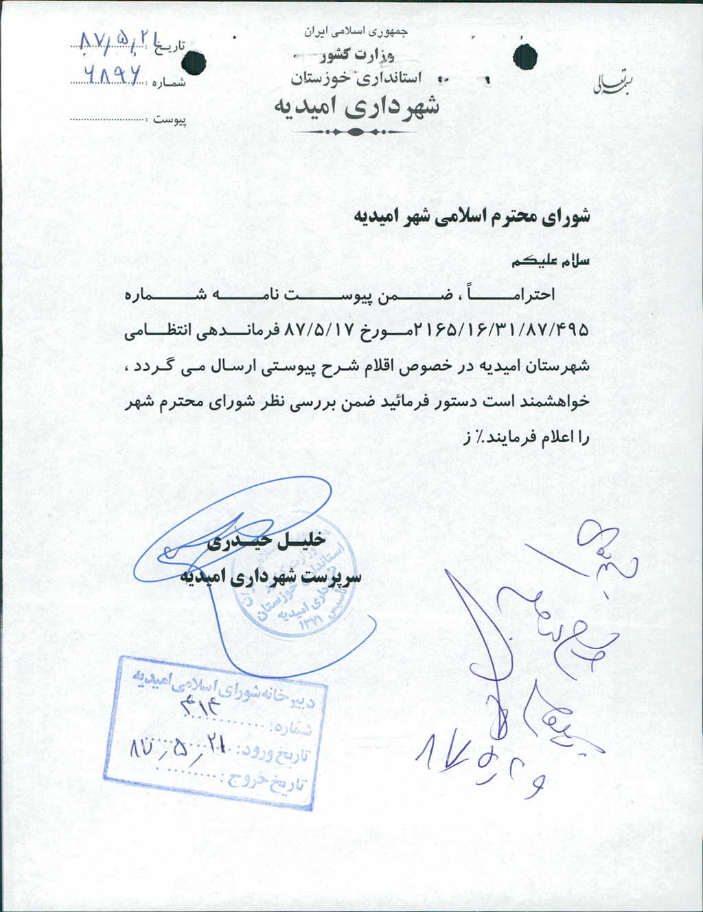 مصوبه شماره ۱۹ جلسه شماره ۲۷ شورای اسلامی شهر امیدیه