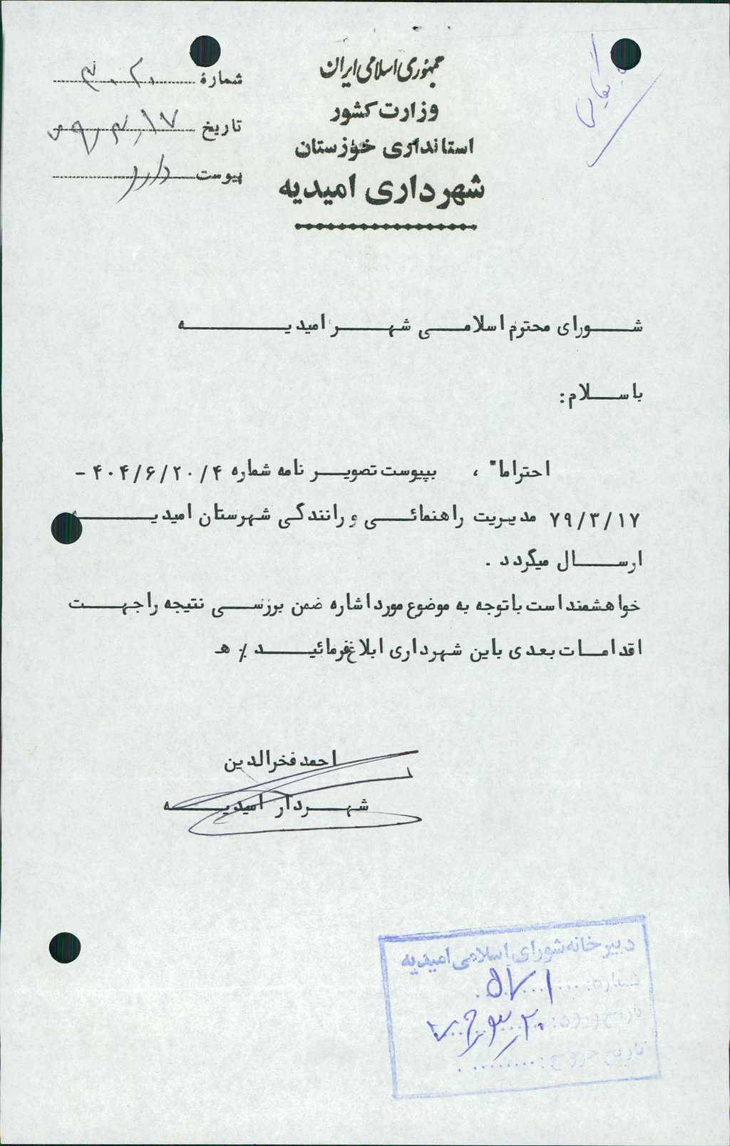 مصوبه شماره ۲ جلسه شماره ۱۰۰ شورای اسلامی شهر امیدیه
