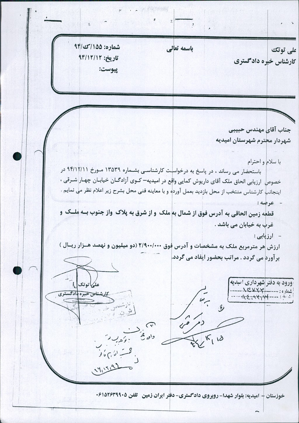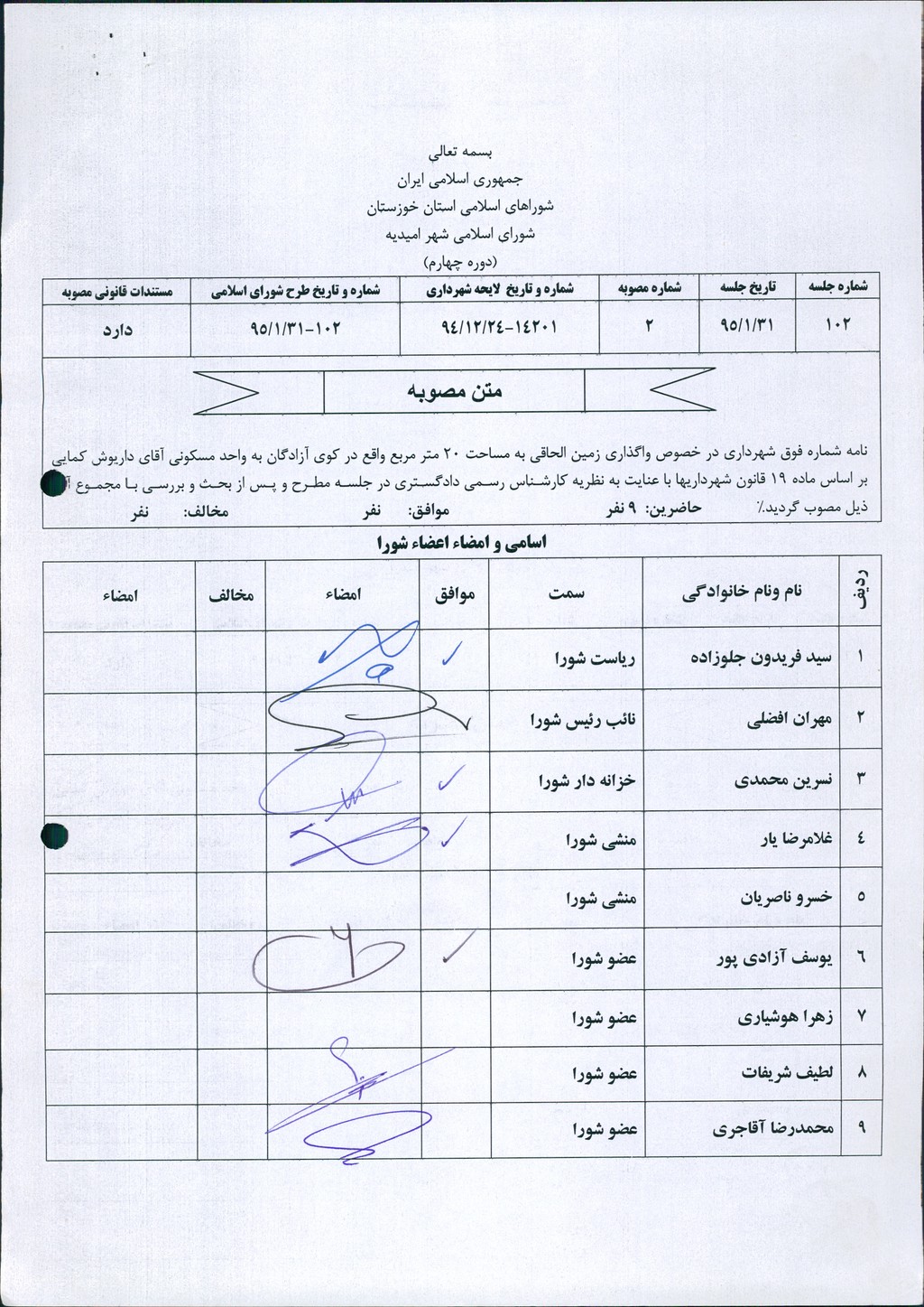 مصوبه شماره ۲ جلسه شماره ۱۰۲ شورای اسلامی شهر امیدیه
