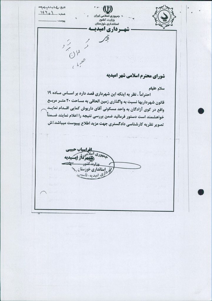 نامه شماره فوق شهرداری در خصوص واگذاری زمین الحاقی به مساحت ۲۰ متر مربع واقع در کوی آزادگان به واحد مسکونی آقای داریوش کمایی بر اساس ماده ۱۹ قانون شهرداریها با عنایت به نظریه کارشناس رسمی دادگستری در جلسه مطرح و پس از بحث و بررسی با مجموع آراء ذیل مصوب گردید%