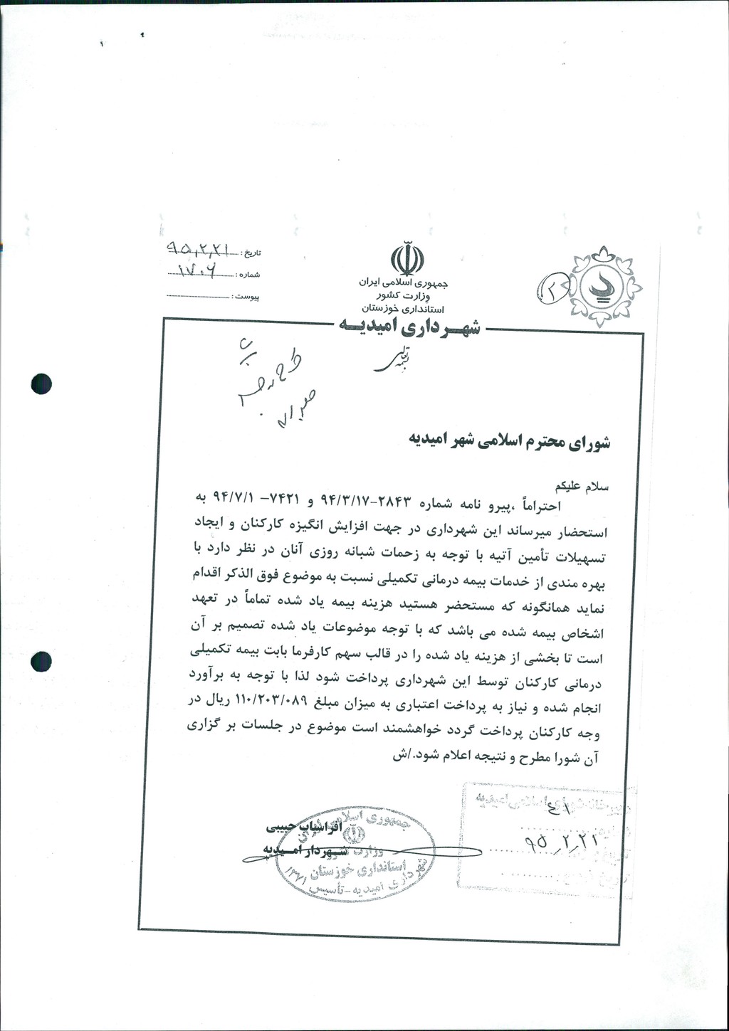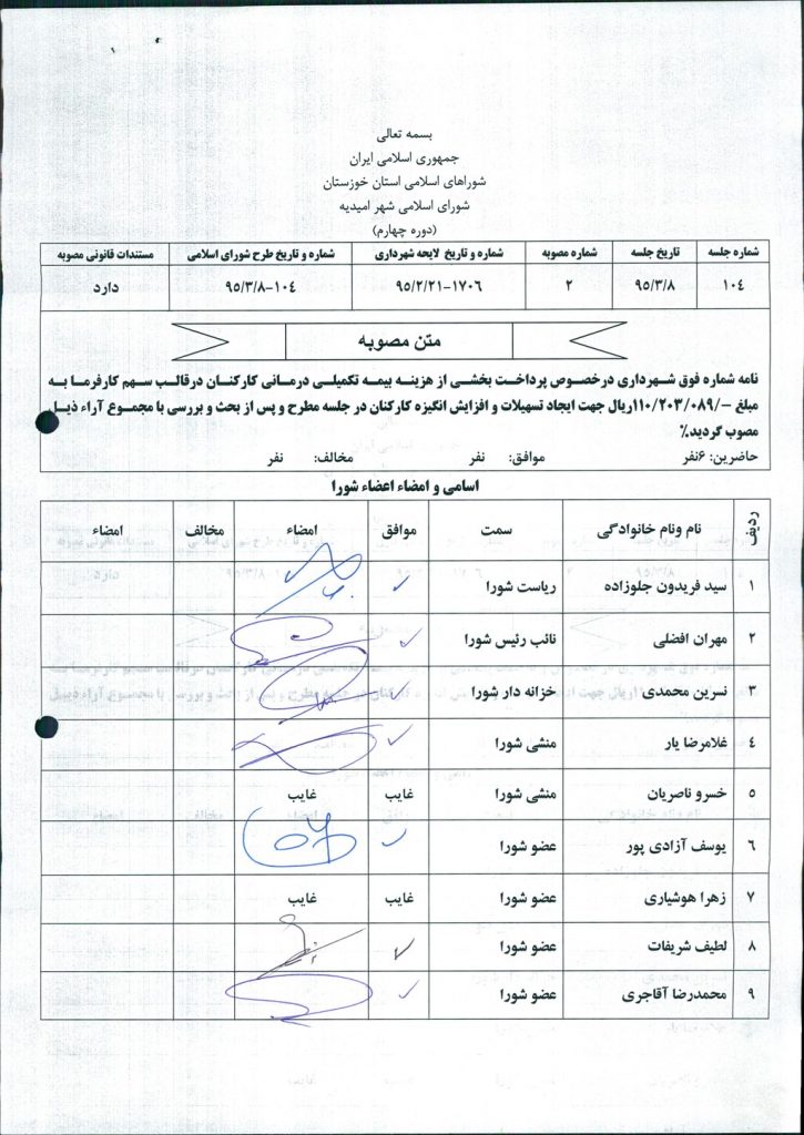 مصوبه شماره ۲ جلسه شماره ۱۰۴ شورای اسلامی شهر امیدیه