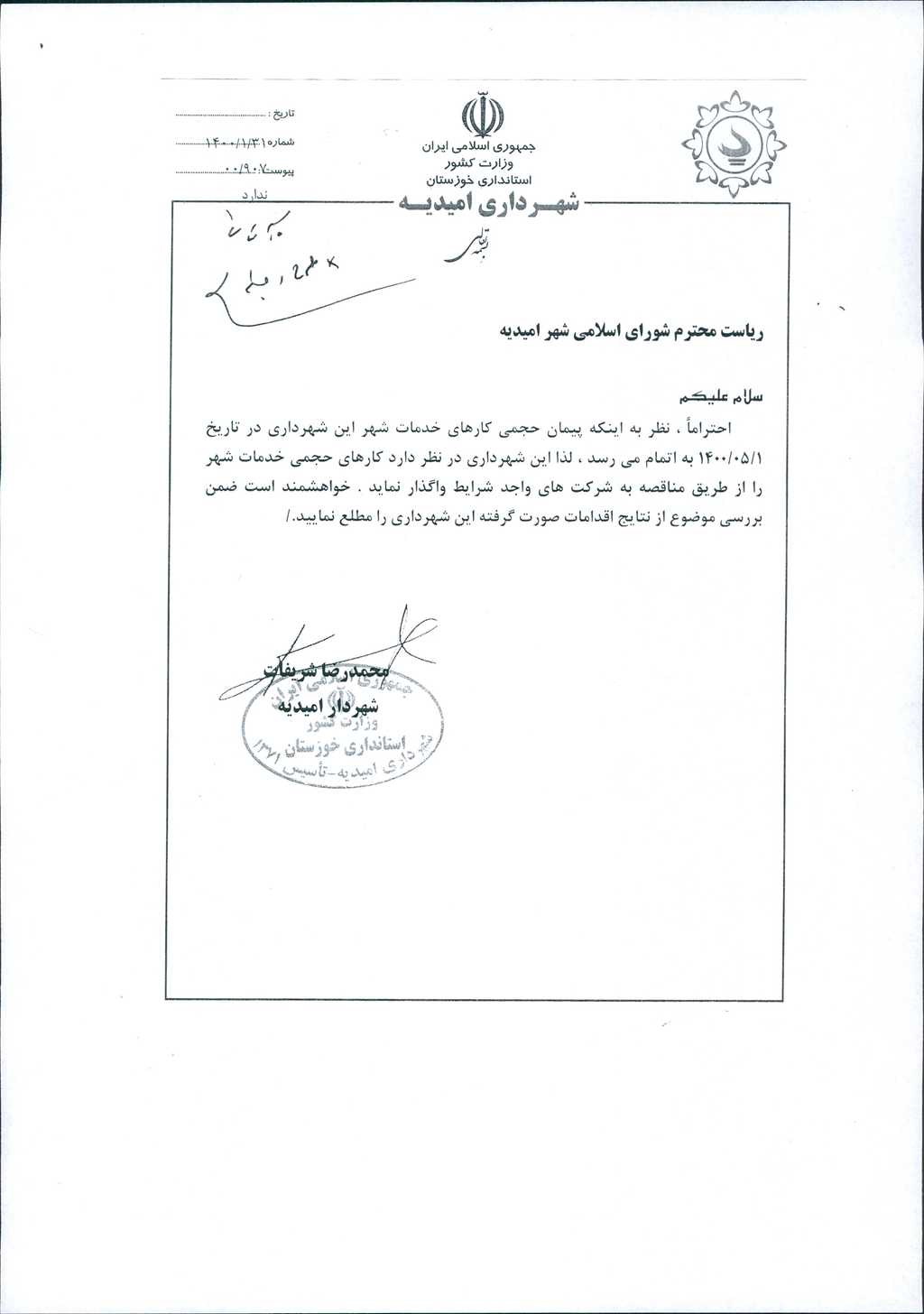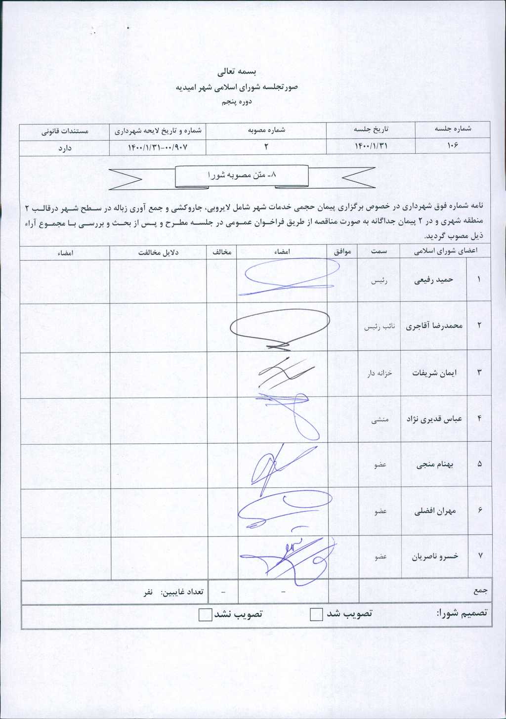 مصوبه شماره ۲ جلسه شماره ۱۰۶ مورخ ۱۴۰۰/۱/۳۱ شورای اسلامی شهر امیدیه