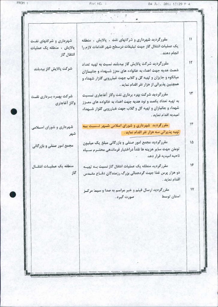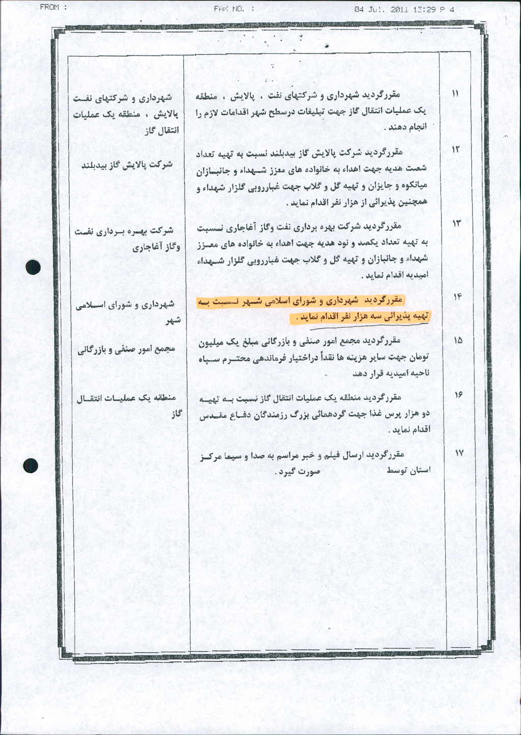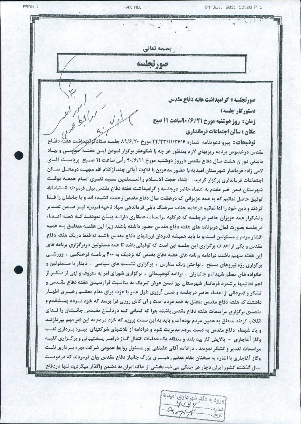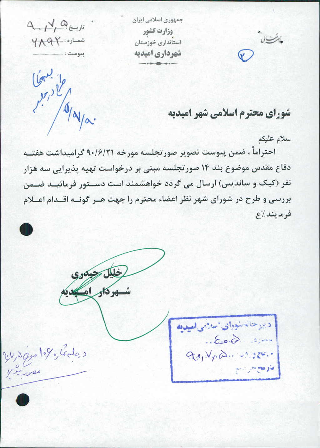 نامه شماره فوق شهرداری در خصوص بند ۱۴ صورتجلسه گرامیداشت هفته دفاع مقد س مورخ ۲۱/ ۶/ ۹۰ مبنی بر تهیه(کیک و ساندیس) جهت پذیرایی سه هزارنفر در جلسه مطرح و پس از  بحث و بررسی با مجموع آراء ذیل مصوب گردید%