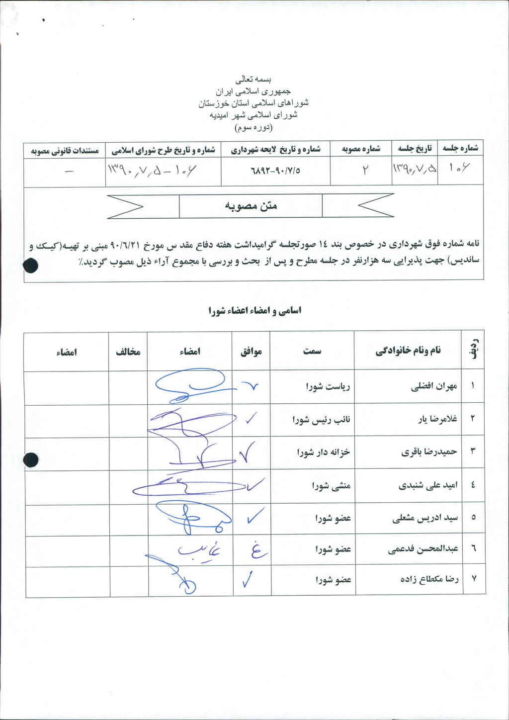مصوبه شماره ۲ جلسه شماره ۱۰۶ شورای اسلامی شهر امیدیه