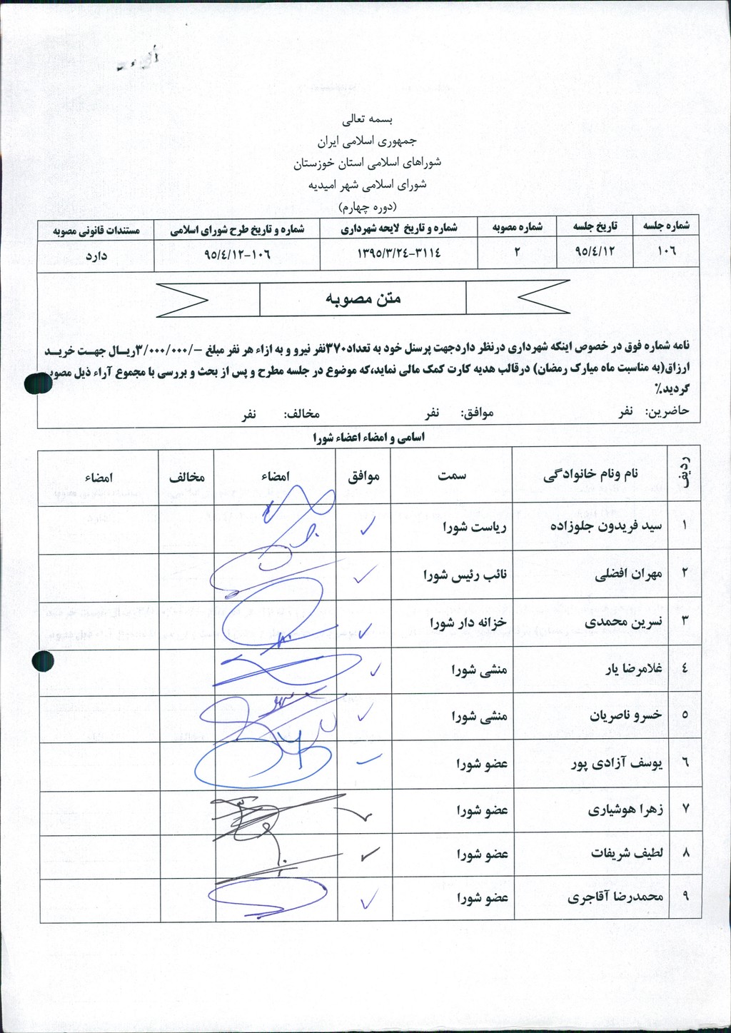 مصوبه شماره ۲ جلسه شماره ۱۰۶ شورای اسلامی شهر امیدیه