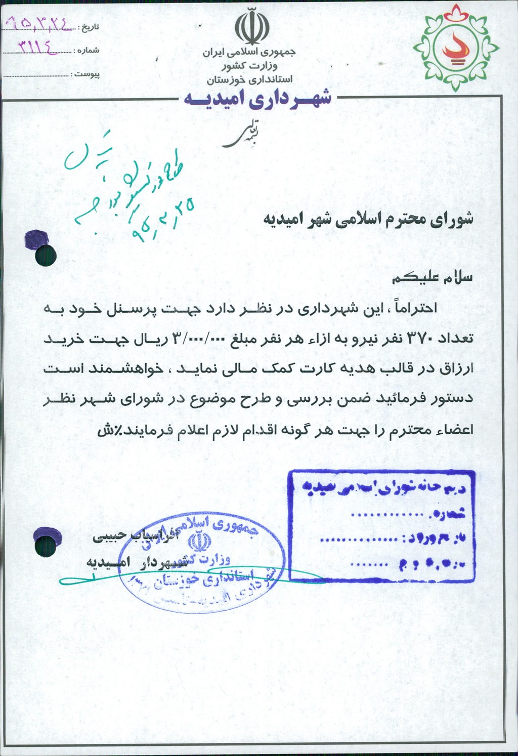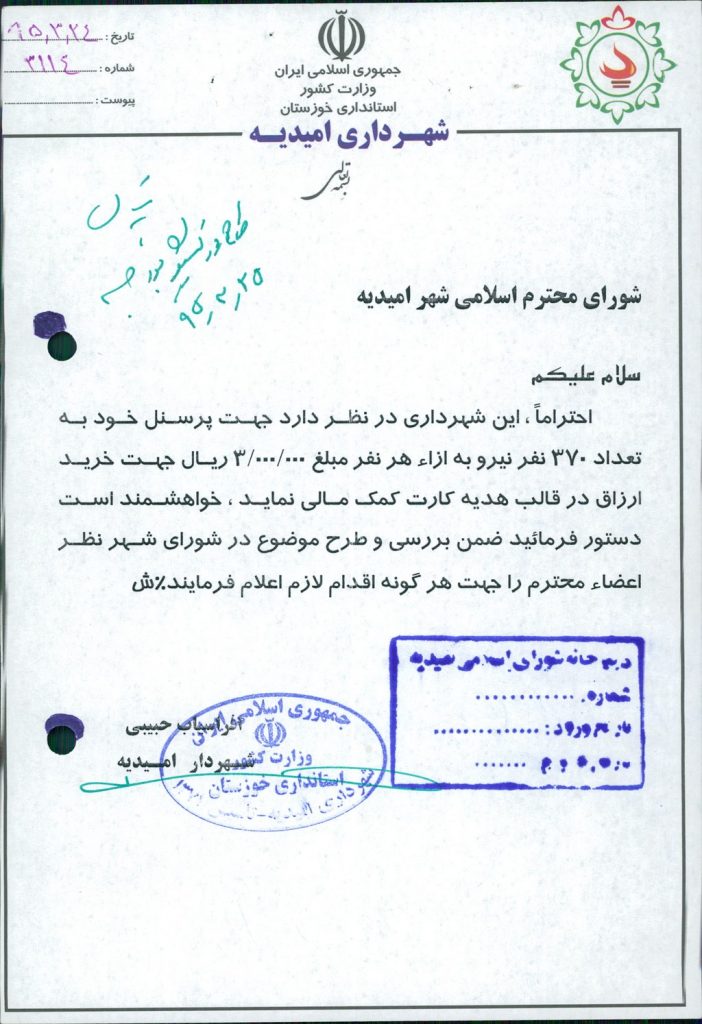نامه شماره فوق در خصوص اینکه شهرداری درنظر داردجهت پرسنل خود به تعداد ۳۷۰ نفر نیرو و به ازاء هر نفر مبلغ ۳۰۰۰۰۰۰ريال جهت خرید ارزاق(به مناسبت ماه میارک رمضان) درقالب هدیه کارت کمک مالی نماید،که موضوع در جلسه مطرح و پس از بحث و بررسی با مجموع آراء ذیل مصوب گردید%