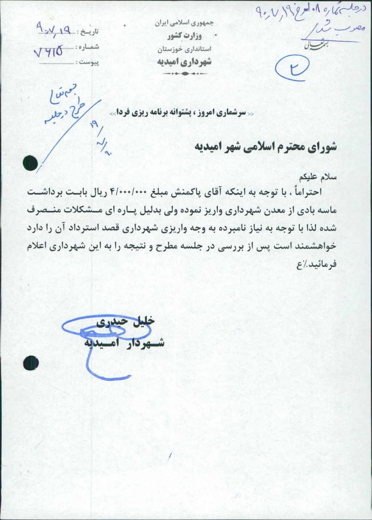نامه شماره فوق در خصوص وجه واریزی آقای پاکمنش به مبلغ -/۰۰۰/۰۰۰/ ۴ريال (چهار میلیون ريال) بابت برداشت ماسه بادی از معدن شهرداری که با عنایت به انصراف ایشان شهرداری قصد استرداد وجه رابه نامبرده دارد . لذا موضوع در جلسه مطرح و پس از بحث و بررسی با مجموع آراء ذیل مصوب گردید%