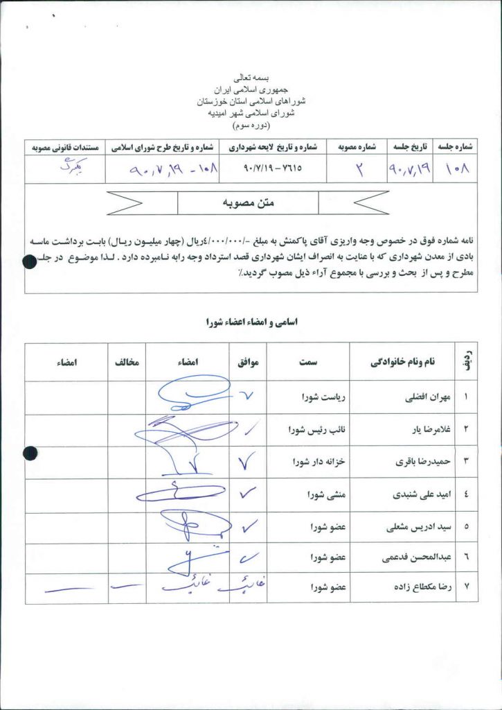 مصوبه شماره ۲ جلسه شماره ۱۰۸ شورای اسلامی شهر امیدیه