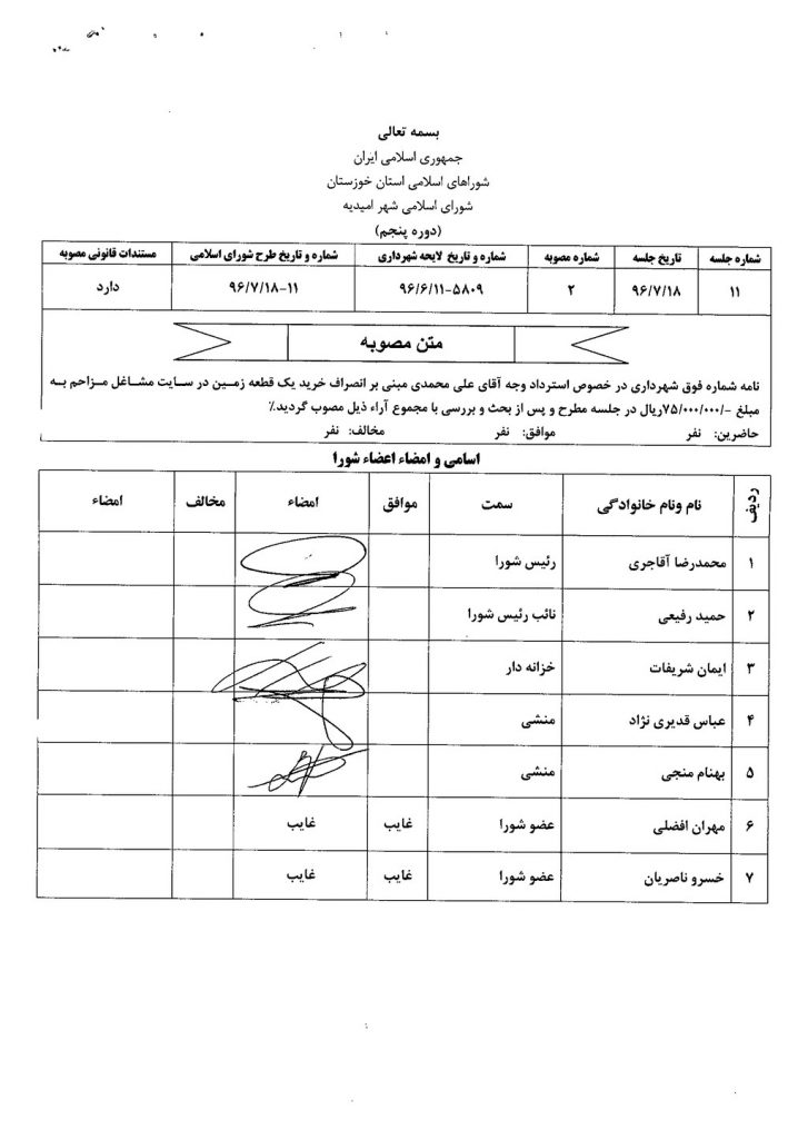 مصوبه شماره ۲ جلسه شماره ۱۱ شورای اسلامی شهر امیدیه