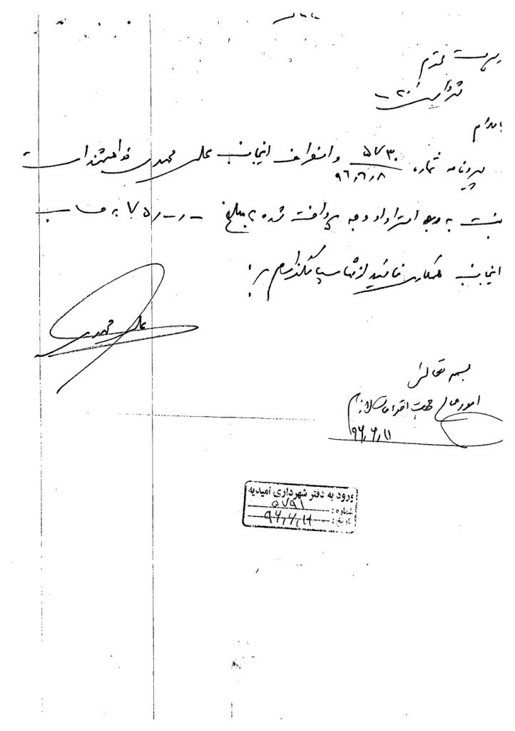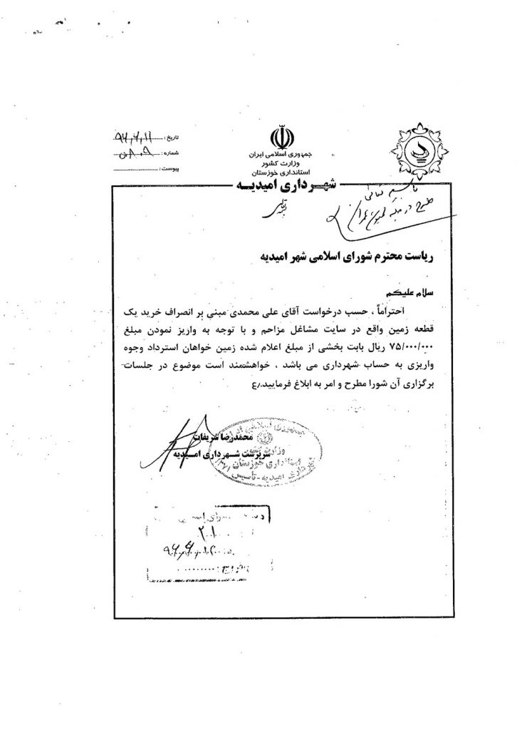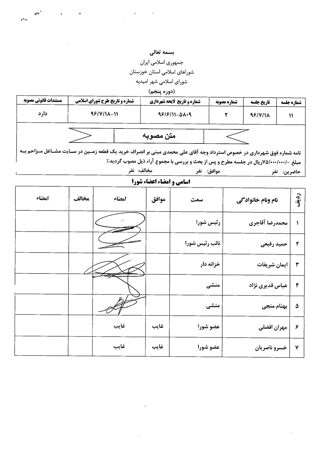نامه شماره فوق شهرداری در خصوص استرداد وجه آقای علی محمدی مبنی بر انصراف خرید یک قطعه زمین در سایت مشاغل مزاحم به مبلغ ۷۵۰۰۰۰۰۰ریال در جلسه مطرح و پس از بحث و بررسی با مجموع آراء ذیل مصوب گردید%