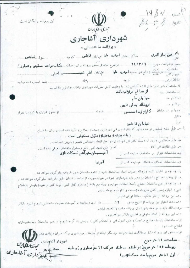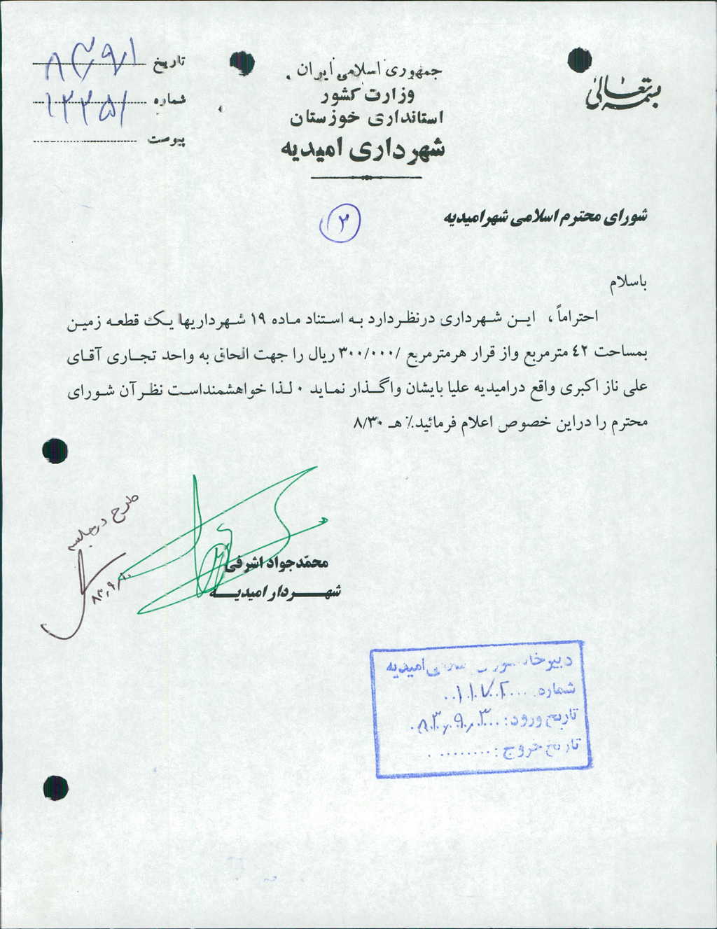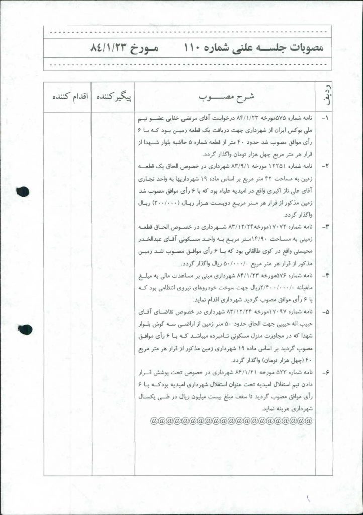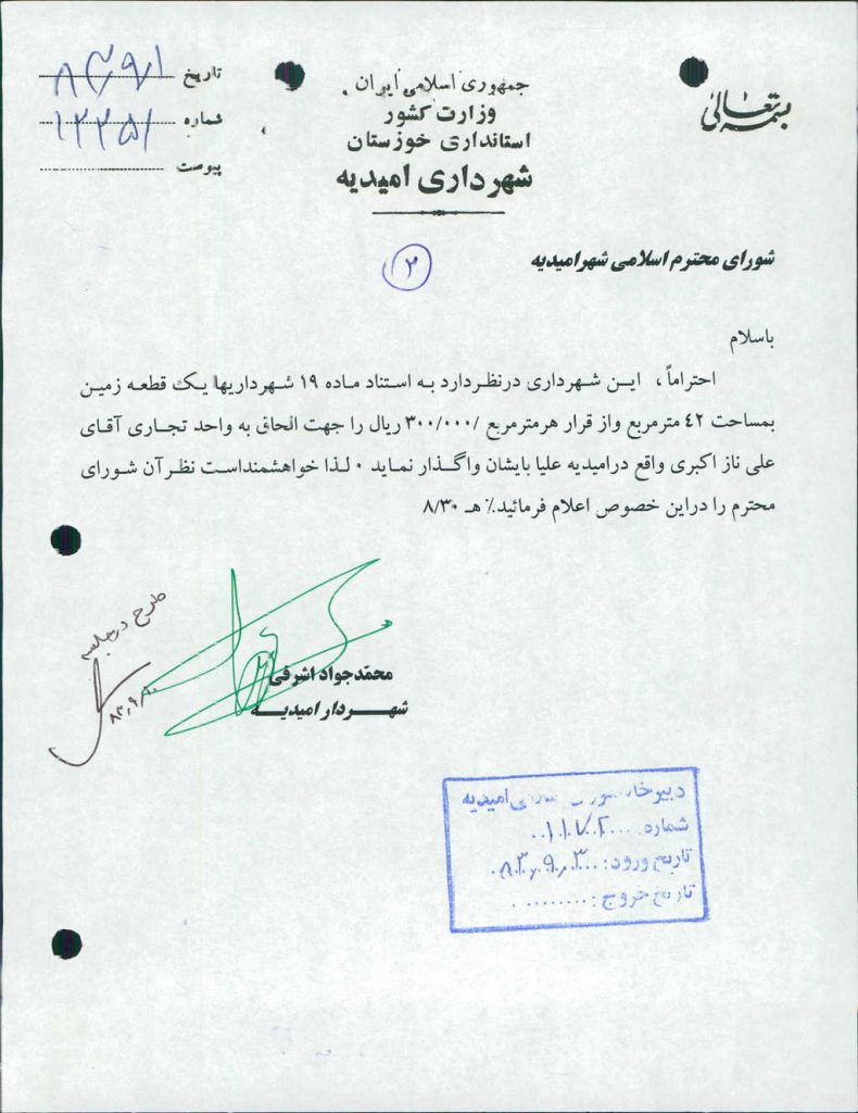 ۲-نامه شماره ۱۲۲۵۱ مورخه ۱/ ۹/ ۸۳ شهرداري در خصوص الحاق يك قطعه زمين به مساحت ۴۲ متر مربع بر اساس ماده ۱۹ شهرداريها به واحد تجاري آقاي علي ناز اكبري واقع در اميديه علياء بود كه با ۶ رأي موافق مصوب شد زمين مذكور از قرار هر متر مربع دويست هزار ريال (۰۰۰/ ۲۰۰) ريال واگذار گردد.