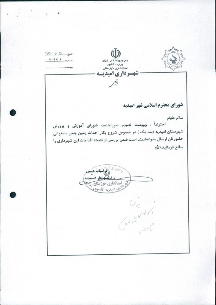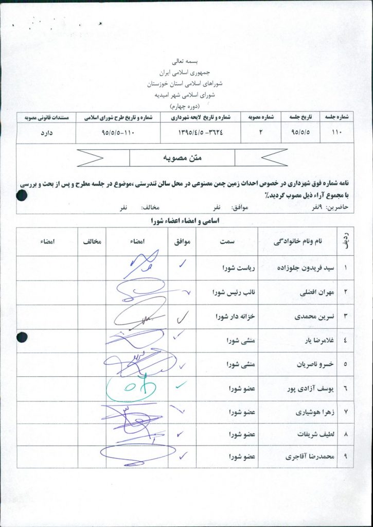 نامه شماره فوق شهرداری در خصوص احداث زمین چمن مصنوعی در محل سالن تندرستی ،موضوع در جلسه مطرح و پس از بحث و بررسی با مجموع آراء ذیل مصوب گردید%