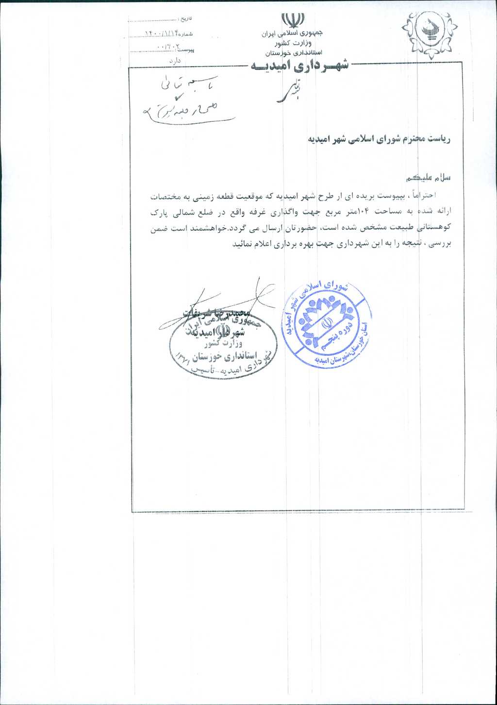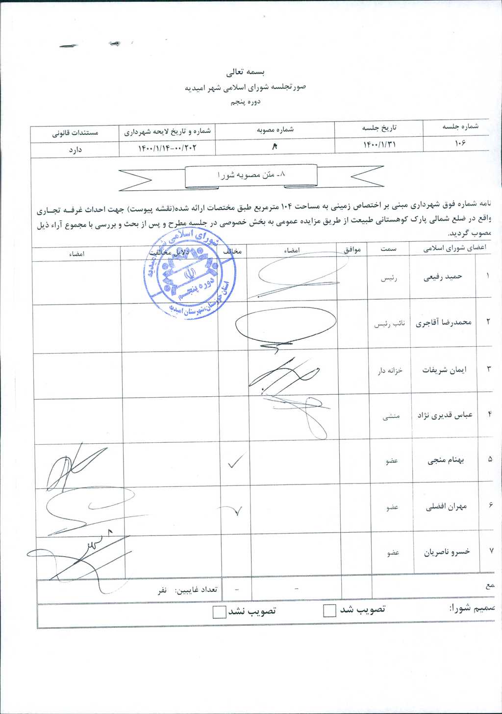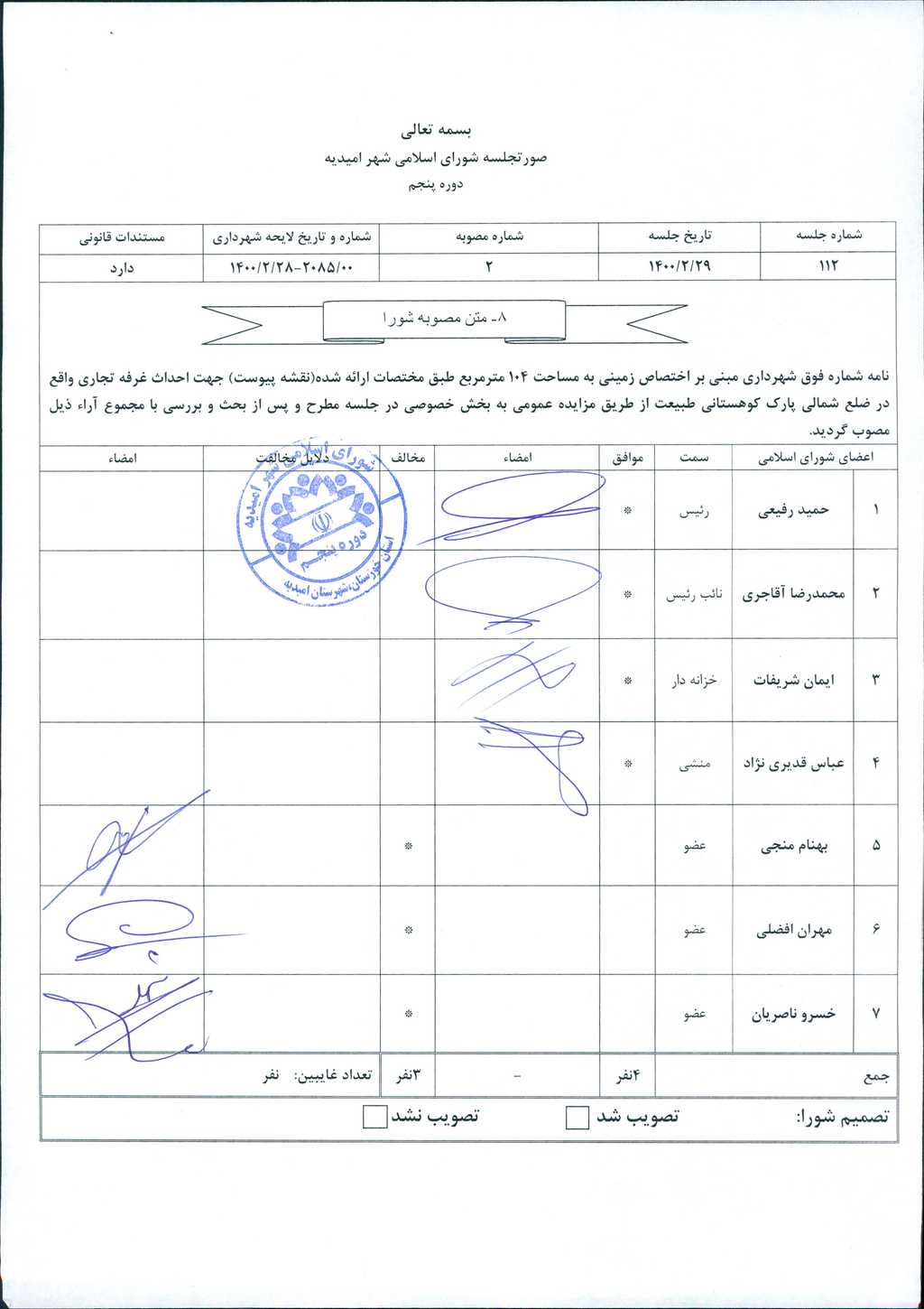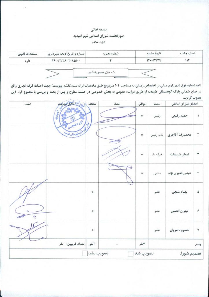 مصوبه شماره ۲ جلسه شماره ۱۱۲ شورای اسلامی شهر امیدیه