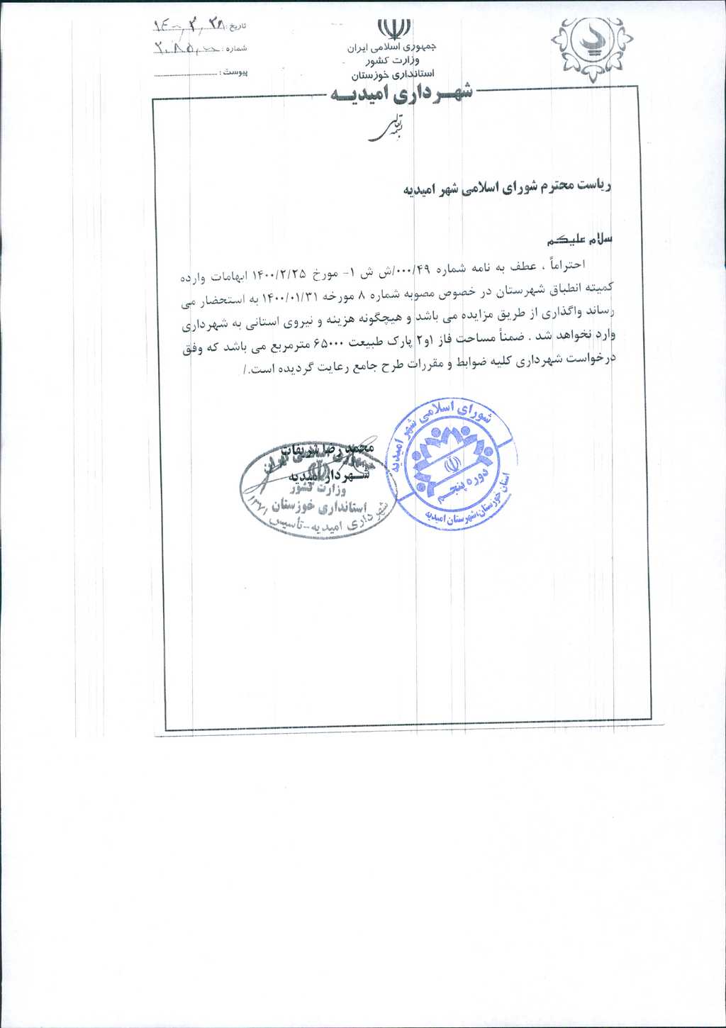 مصوبه شماره ۲ جلسه شماره ۱۱۲ مورخ ۱۴۰۰/۲/۲۹ شورای اسلامی شهر امیدیه