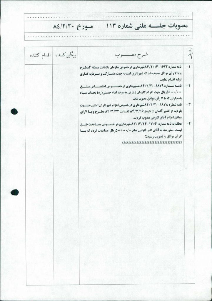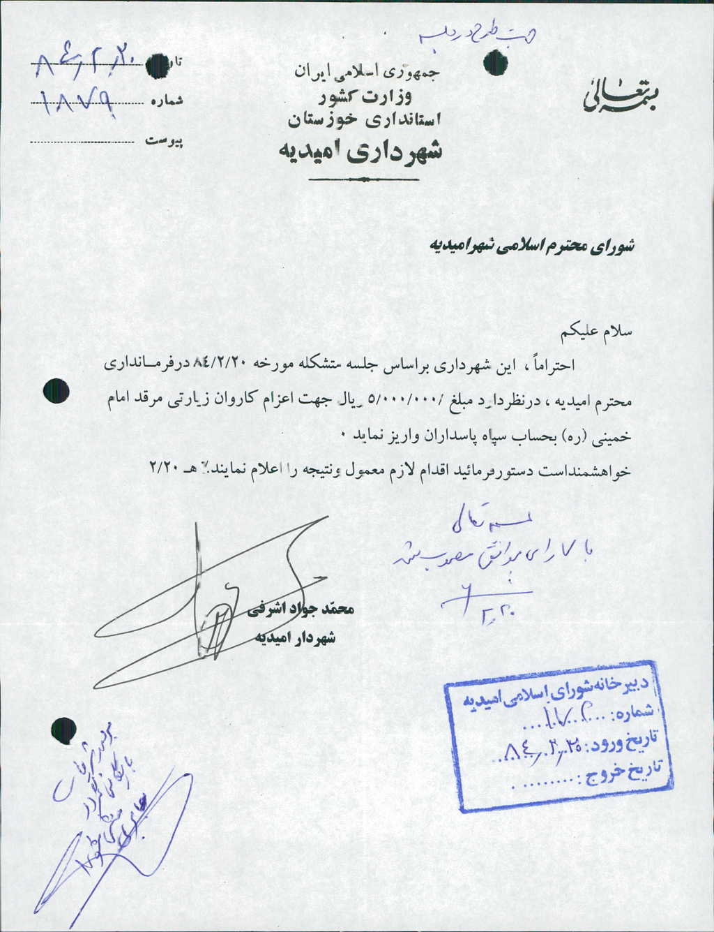 ۲-نامه شماره ۱۸۷۹-۲۰/ ۲/ ۸۴ شهرداري درخصوص اختصاص مبلغ ۰۰۰/۰۰۰/ ۵ريال جهت اعزام كاروان زيارتي به مرقد امام خميني(ره) بحساب سپاه پاسداران كه با۷ رأي موافق مصوب شد.