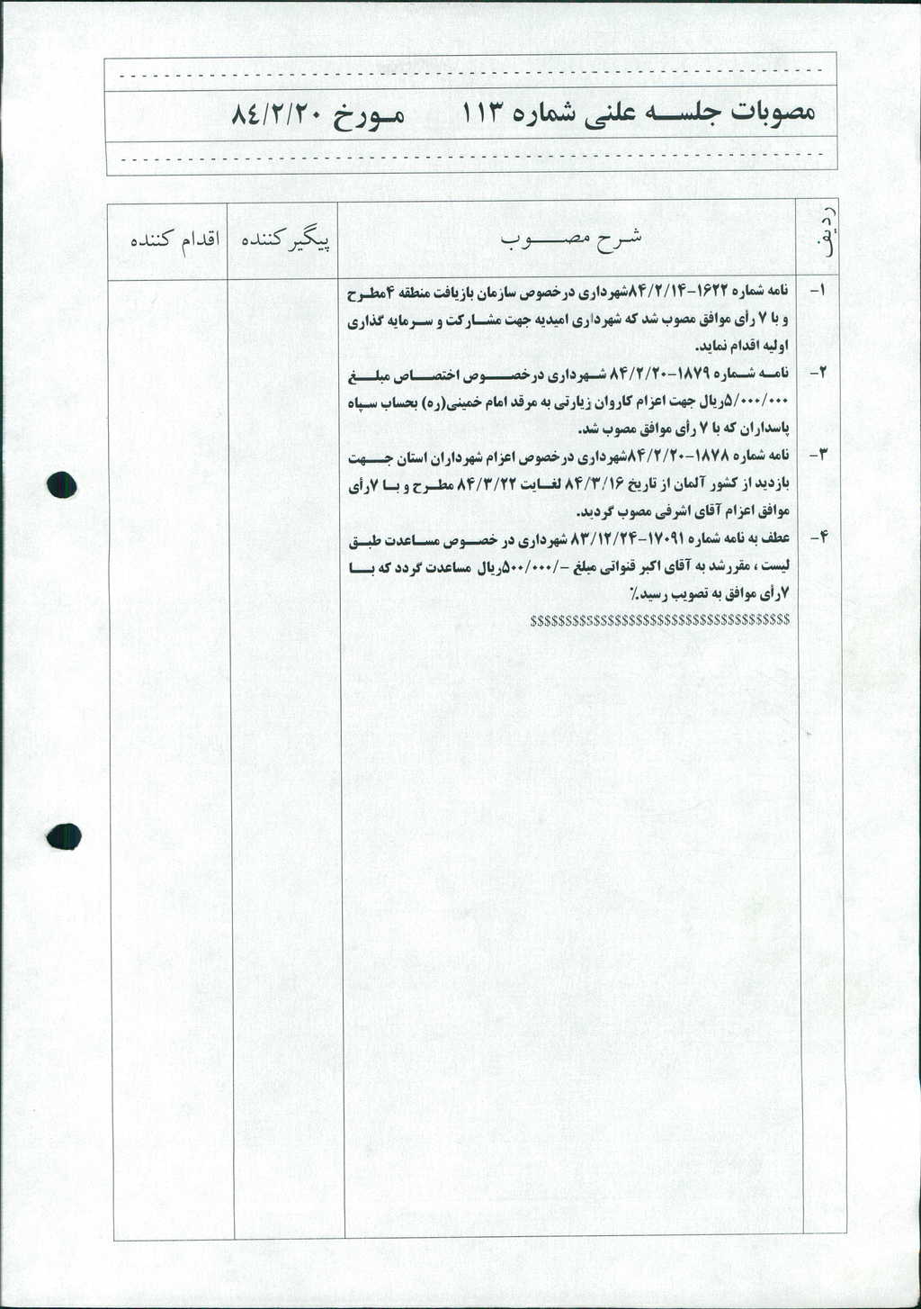 مصوبه شماره ۲ جلسه شماره ۱۱۳ مورخ ۸۴/۲/۲۰ شورای اسلامی شهر امیدیه