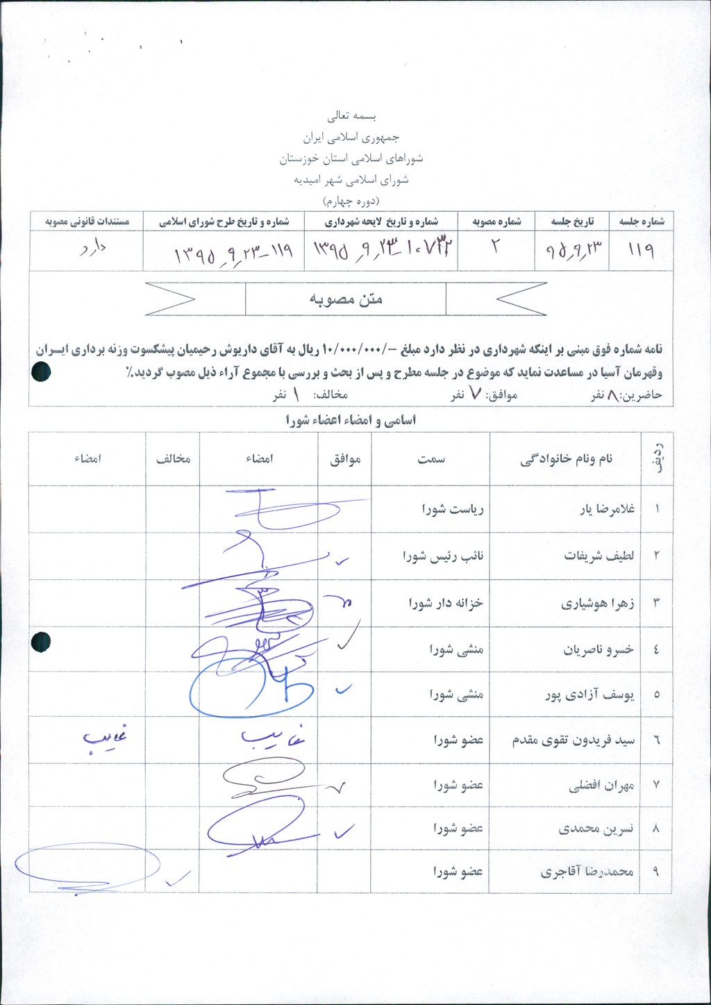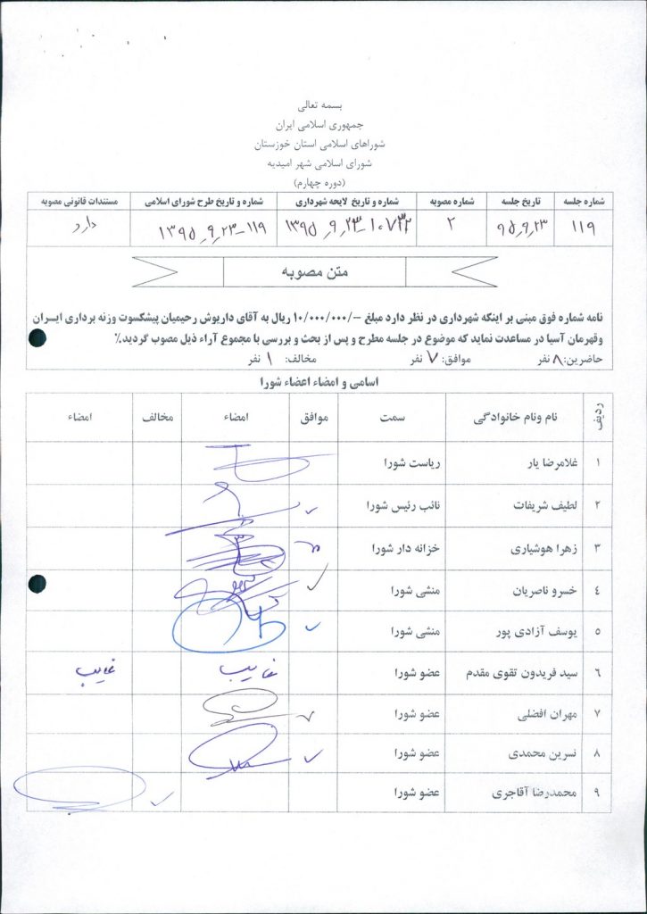 مصوبه شماره ۲ جلسه شماره ۱۱۹ شورای اسلامی شهر امیدیه
