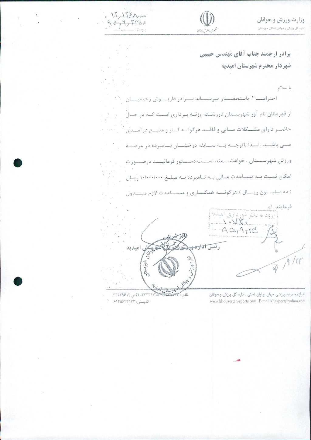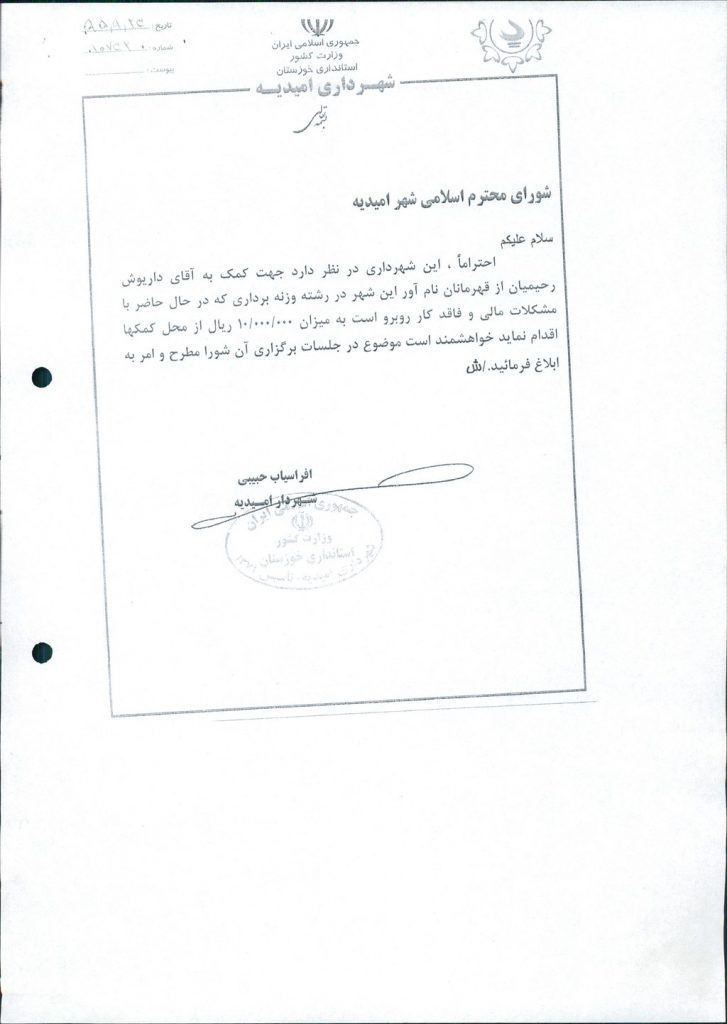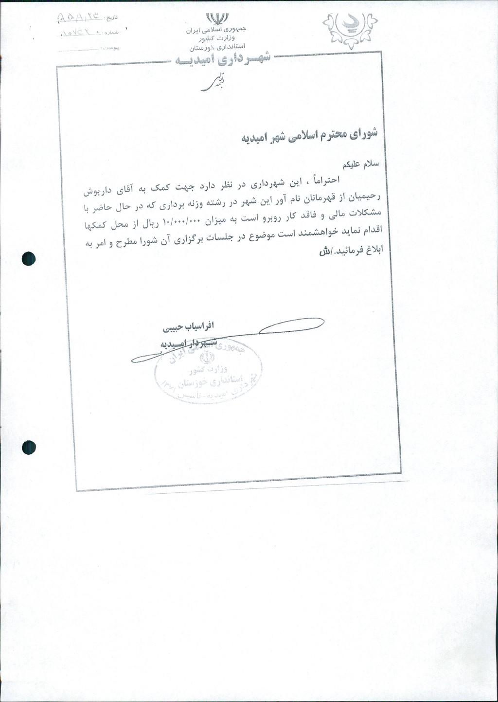 نامه شماره فوق مبنی بر اینکه شهرداری در نظر دارد مبلغ ۱۰۰۰۰۰۰۰ ریال به آقای داریوش رحیمیان پیشکسوت وزنه برداری ایران وقهرمان آسیا در مساعدت نماید که موضوع در جلسه مطرح و پس از بحث و بررسی با مجموع آراء ذیل مصوب گردید%