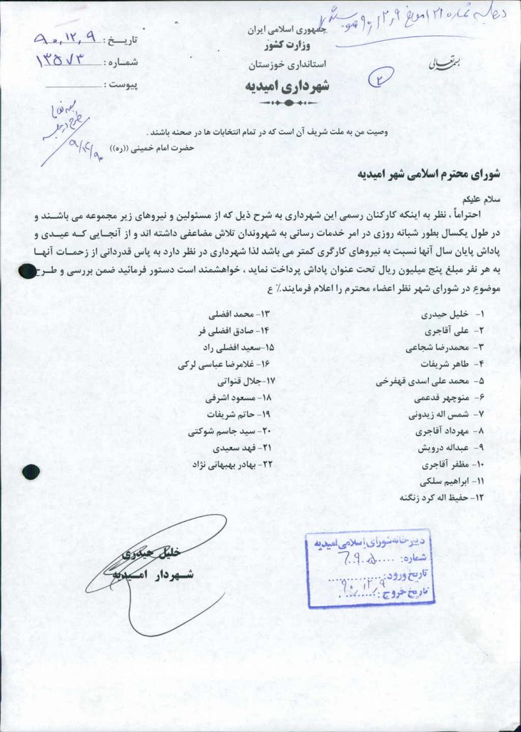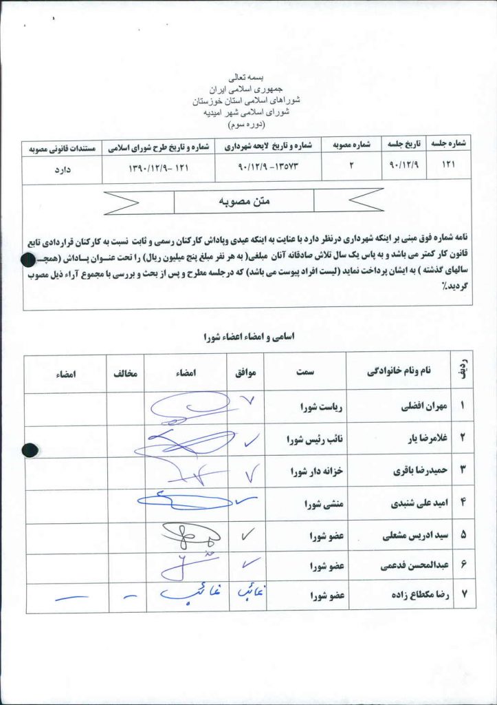 مصوبه شماره ۲ جلسه شماره ۱۲۱ شورای اسلامی شهر امیدیه