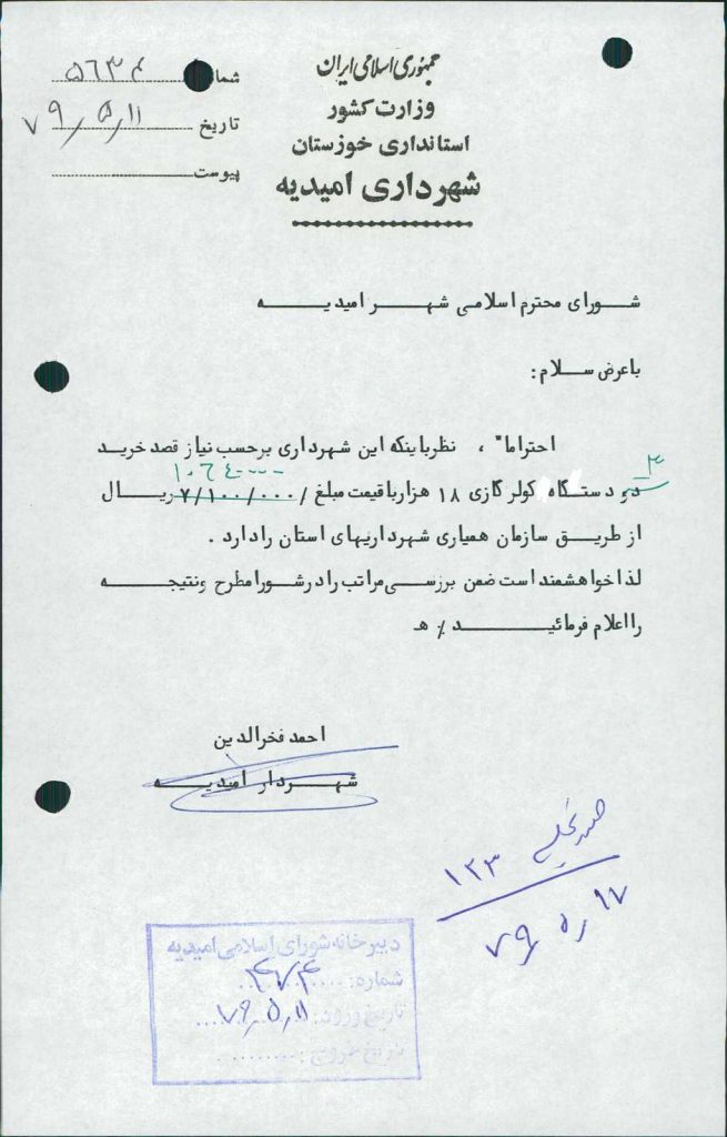 مصوبه شماره ۲ جلسه شماره ۱۲۳ مورخ ۷۹/۵/۱۷ شورای اسلامی شهر امیدیه