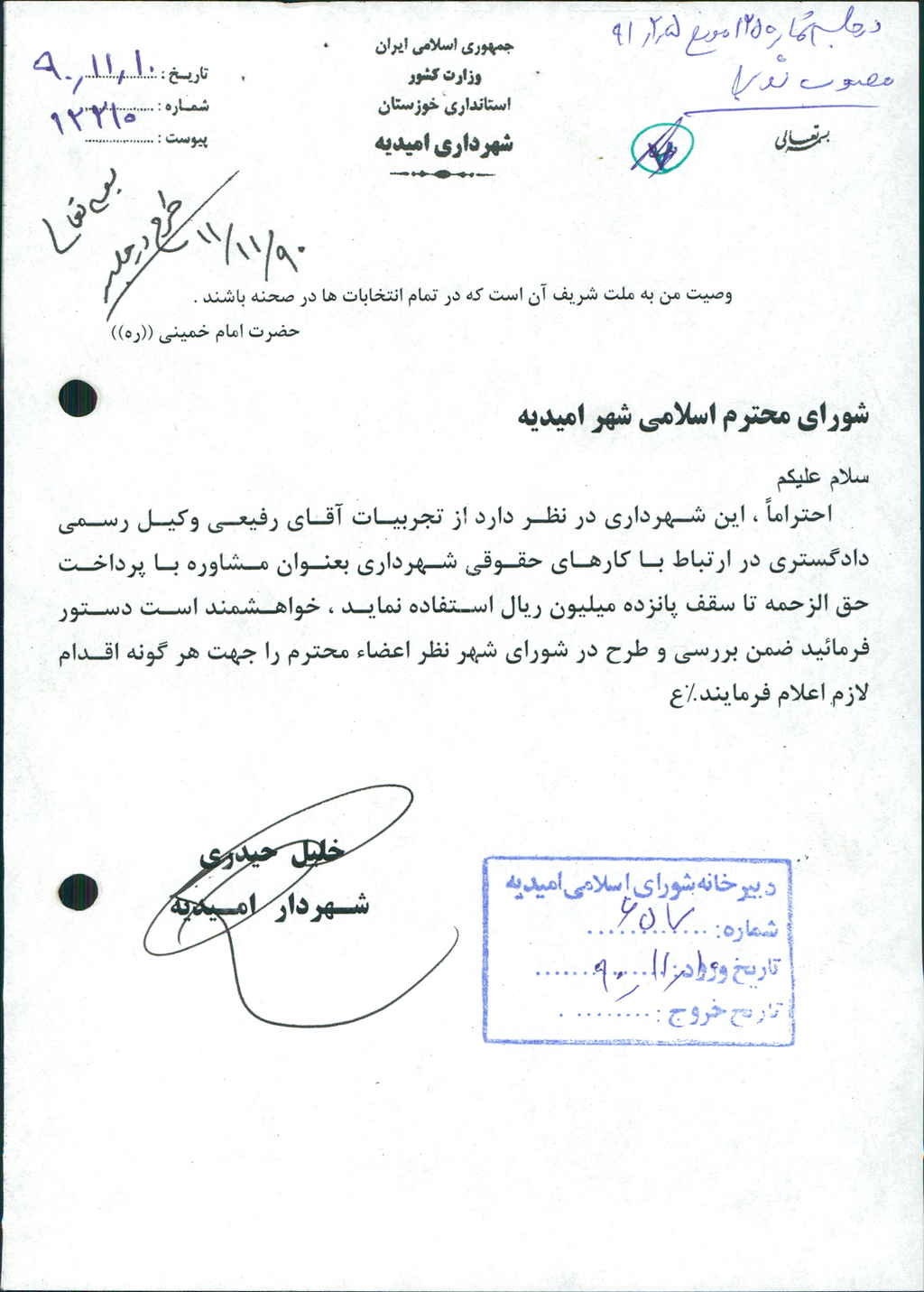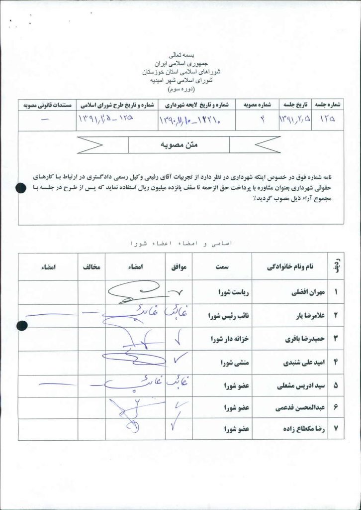 مصوبه شماره ۲ جلسه شماره ۱۲۵ شورای اسلامی شهر امیدیه