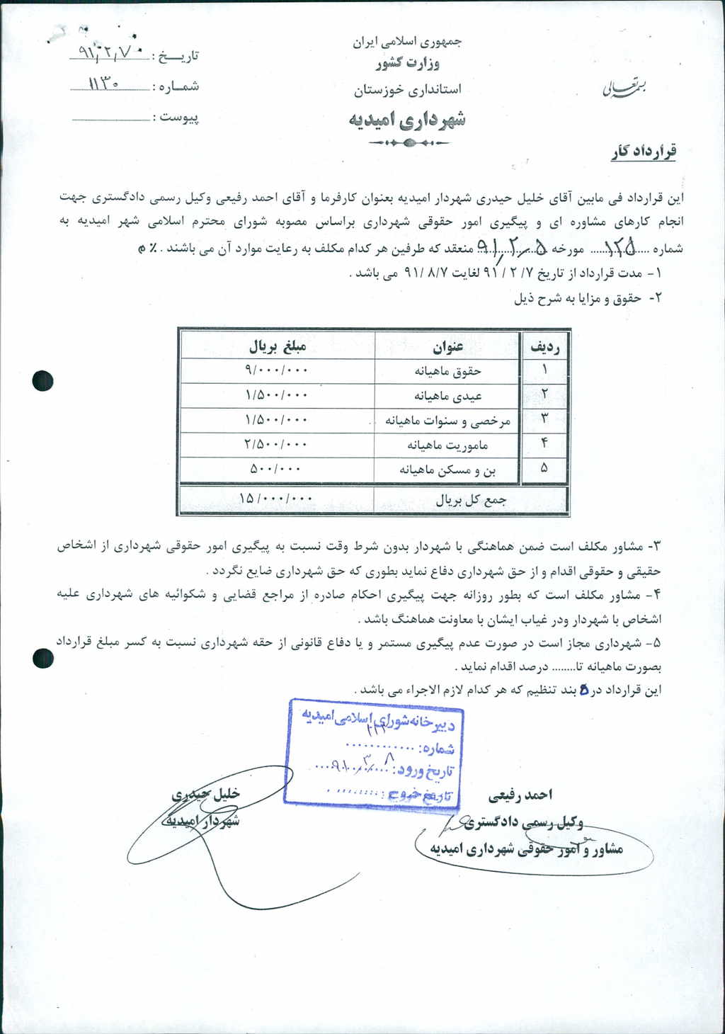 نامه شماره فوق در خصوص اینکه شهرداری در نظر دارد از تجربیات آقای رفیعی وکیل رسمی دادگستری در ارتباط با کارهای حقوقی شهرداری بعنوان مشاوره با پرداخت حق الزحمه تا سقف پانزده میلیون ريال استفاده نماید که پس از طرح در جلسه با مجموع آراء ذیل مصوب گردید%