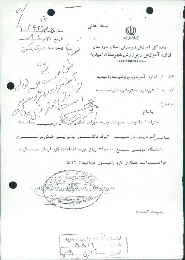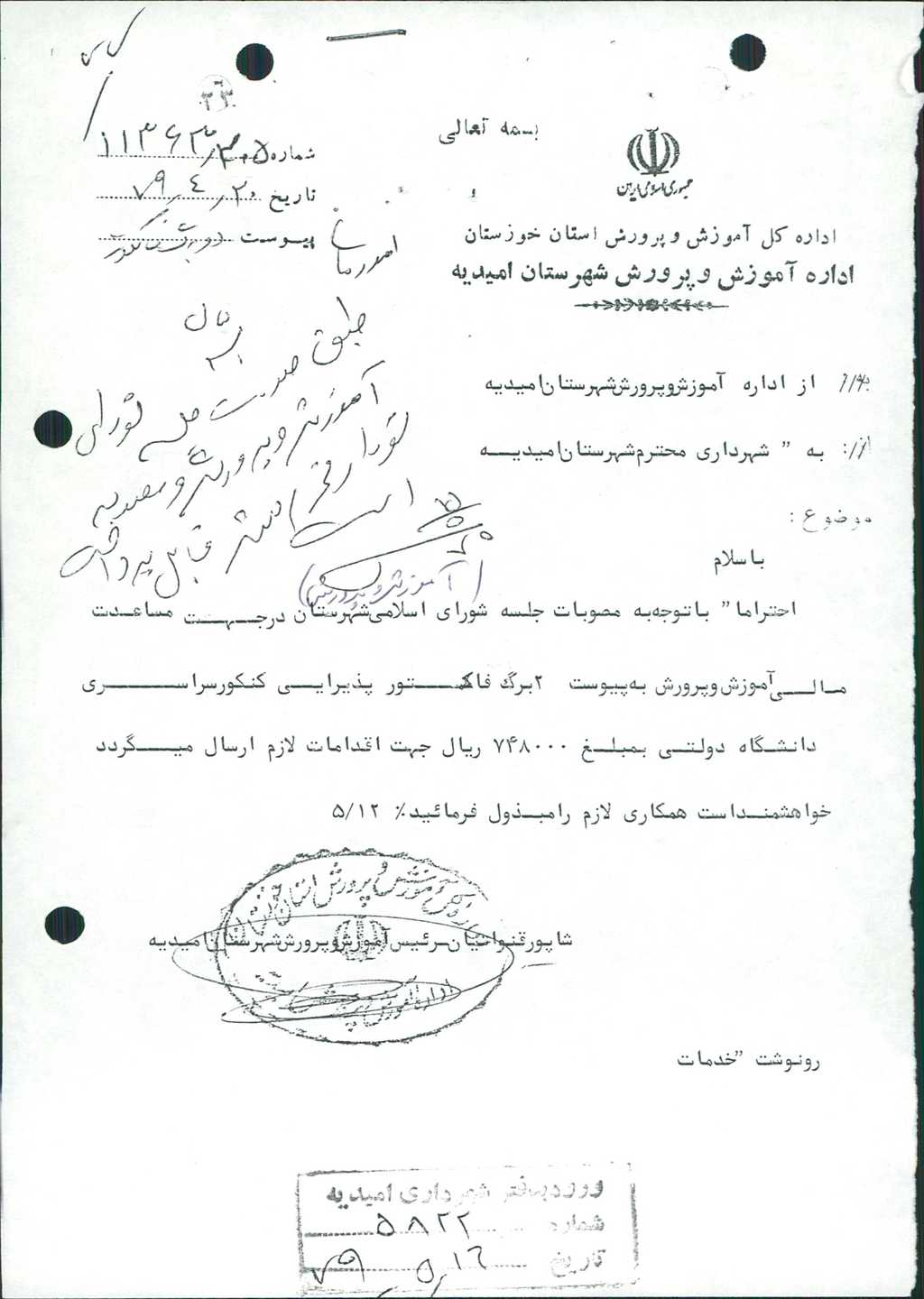 ۲-نامه شماره ۶۱۴۷ مورخه ۲۳/ ۵/ ۷۹ شهرداري در رابطه با مساعدت مالي به آموزش و پرورش در رابطه با برگزاري كنكور سراسري به مبلغ -/۰۰۰/ ۷۴۸ ريال طبق فاكتورهاي پيوست مطرح و با تعداد ۷ رأي موافق به تصويب رسيد.