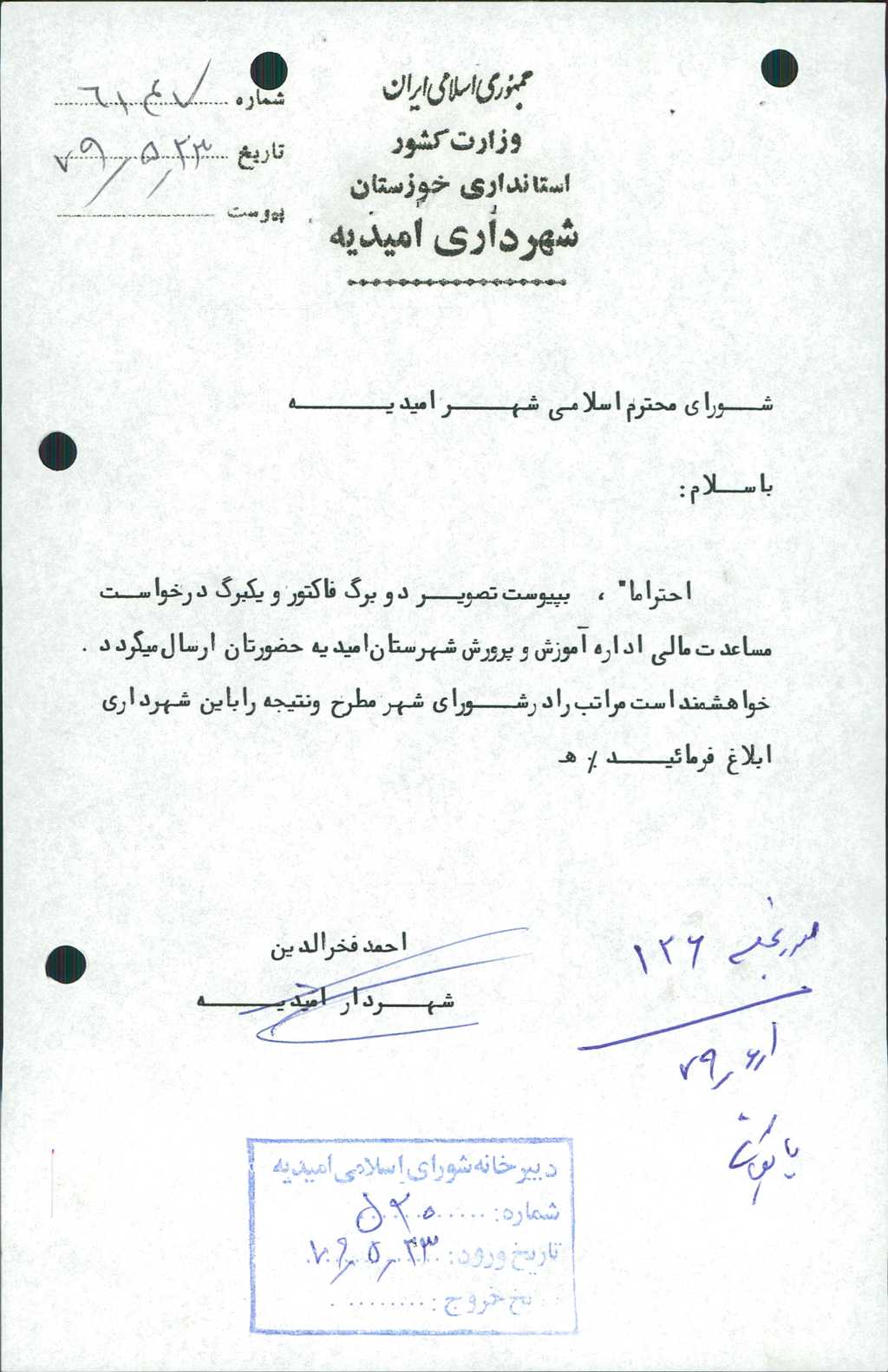 مصوبه شماره ۲ جلسه شماره ۱۲۶ مورخ ۷۹/۶/۱ شورای اسلامی شهر امیدیه